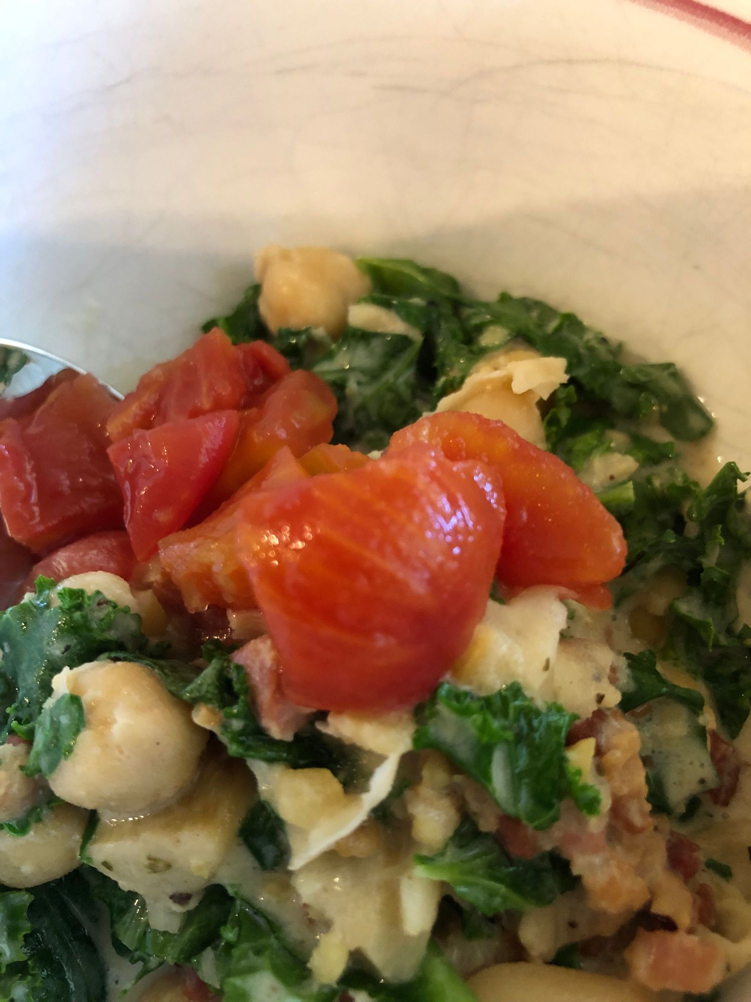 With additions of 6 oz crispy pancetta ( cooked with the cut garlic head), kale and rotel.