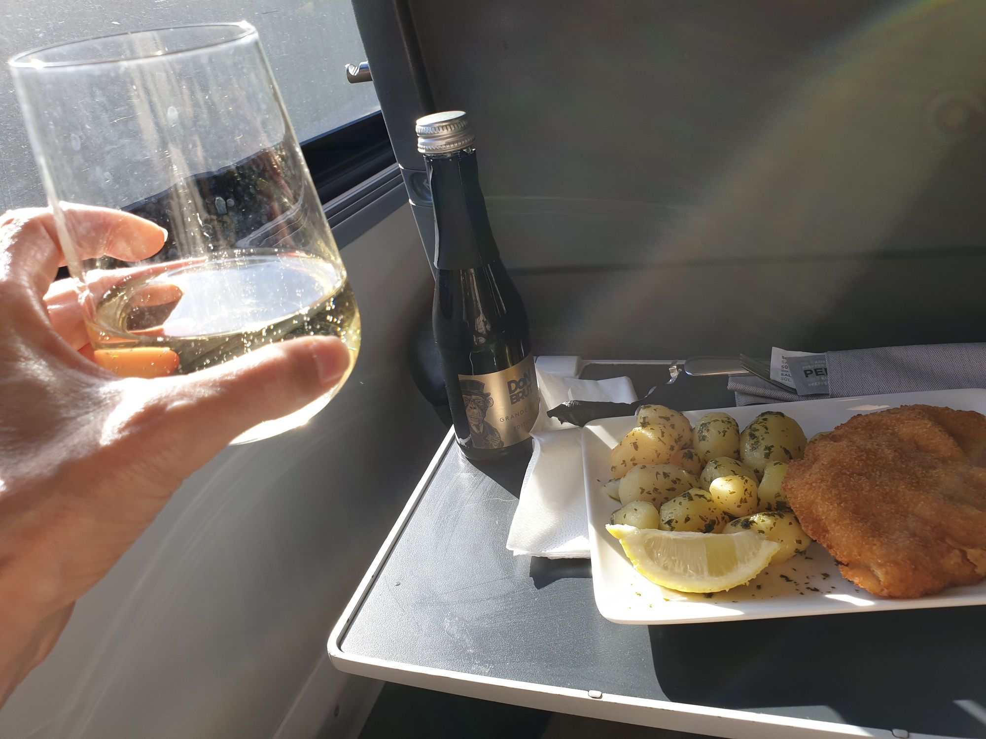 Sekt (Austrian sparkling wine) and schnitzel on the train