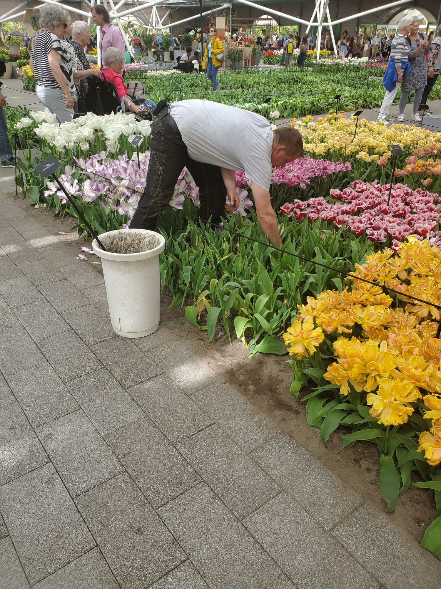 Underneath the exhibition pavilion. Dozens of varieties on display. Here the worker is cutting off the blooms. Imagine this on a much larger scale with the surrounding fields. When I was there in late April, the fields from the viewing platform had lots of tulips (see photo). The lady next to me on the plane visited three days later and the fields were almost all green (cut).