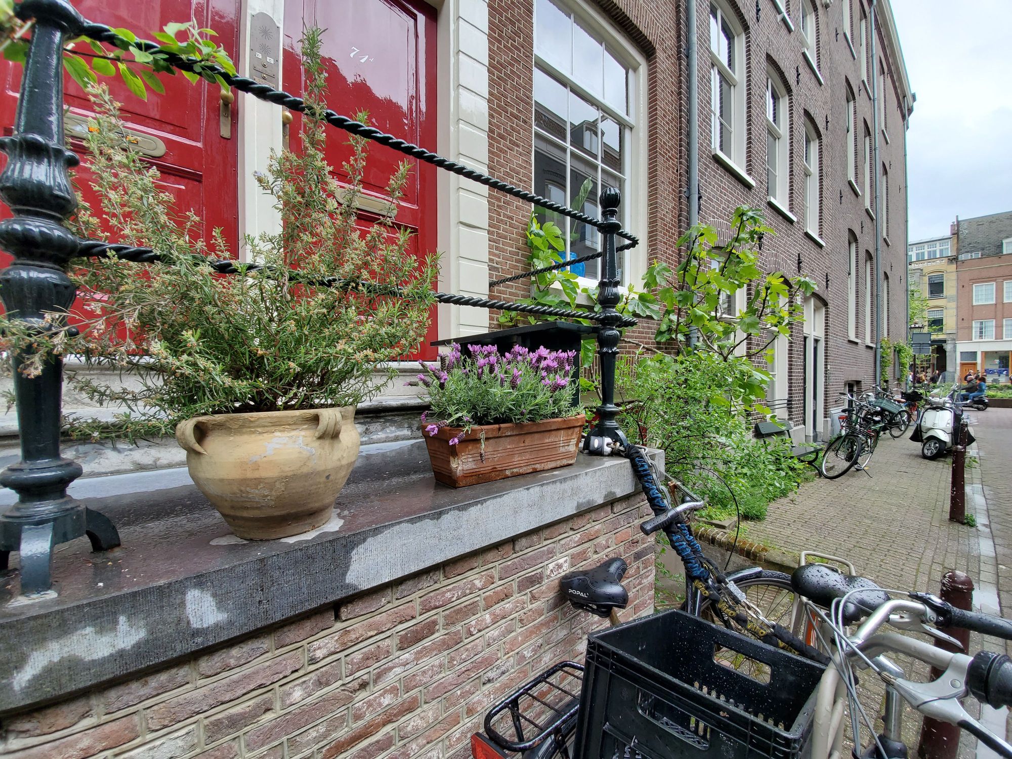 A few flowers in planters