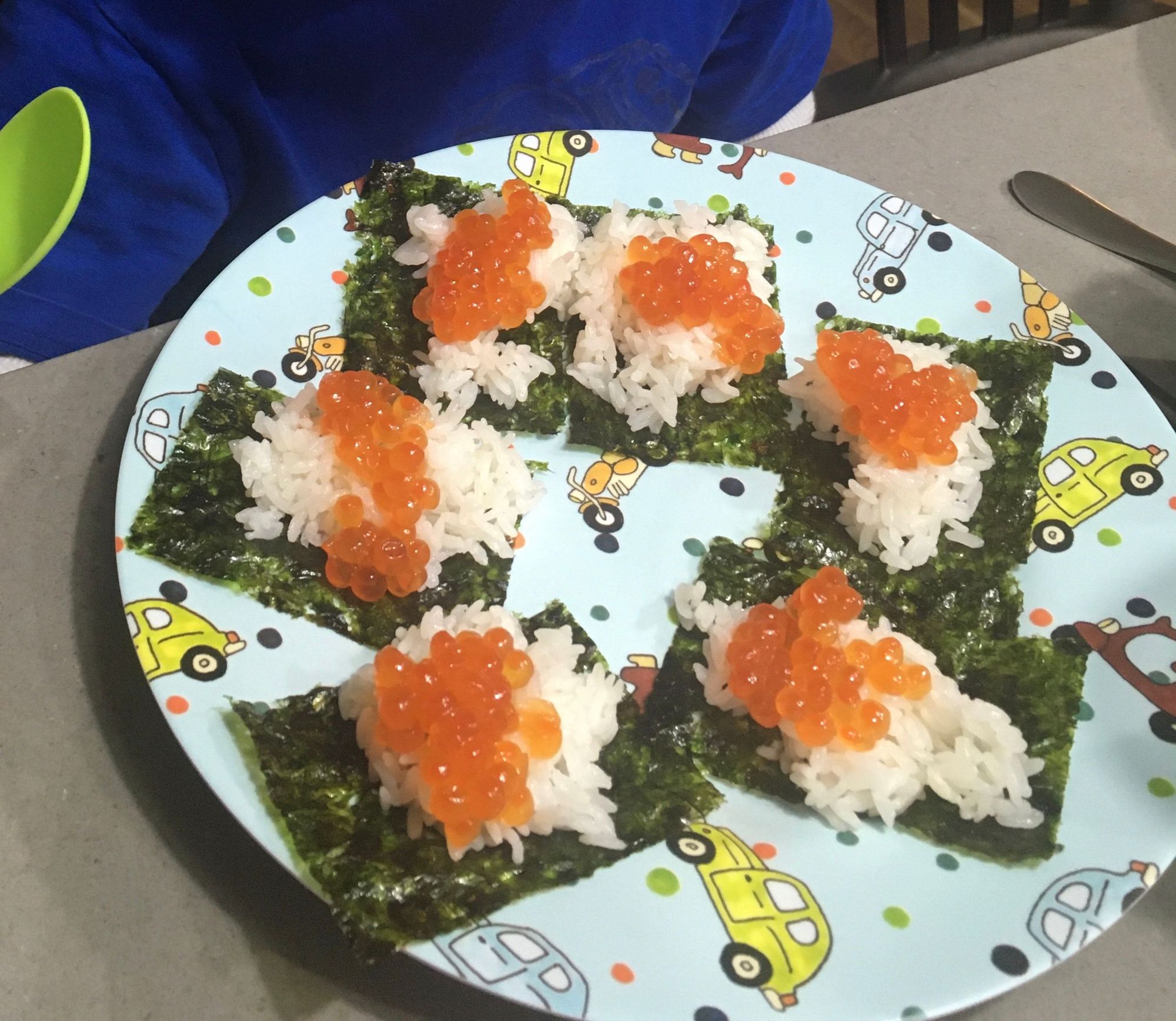 Finally able to post photos! This was the deconstructed sushi with ikura (salmon roe). M-yk ate this plate and a second helping of 5 more.
