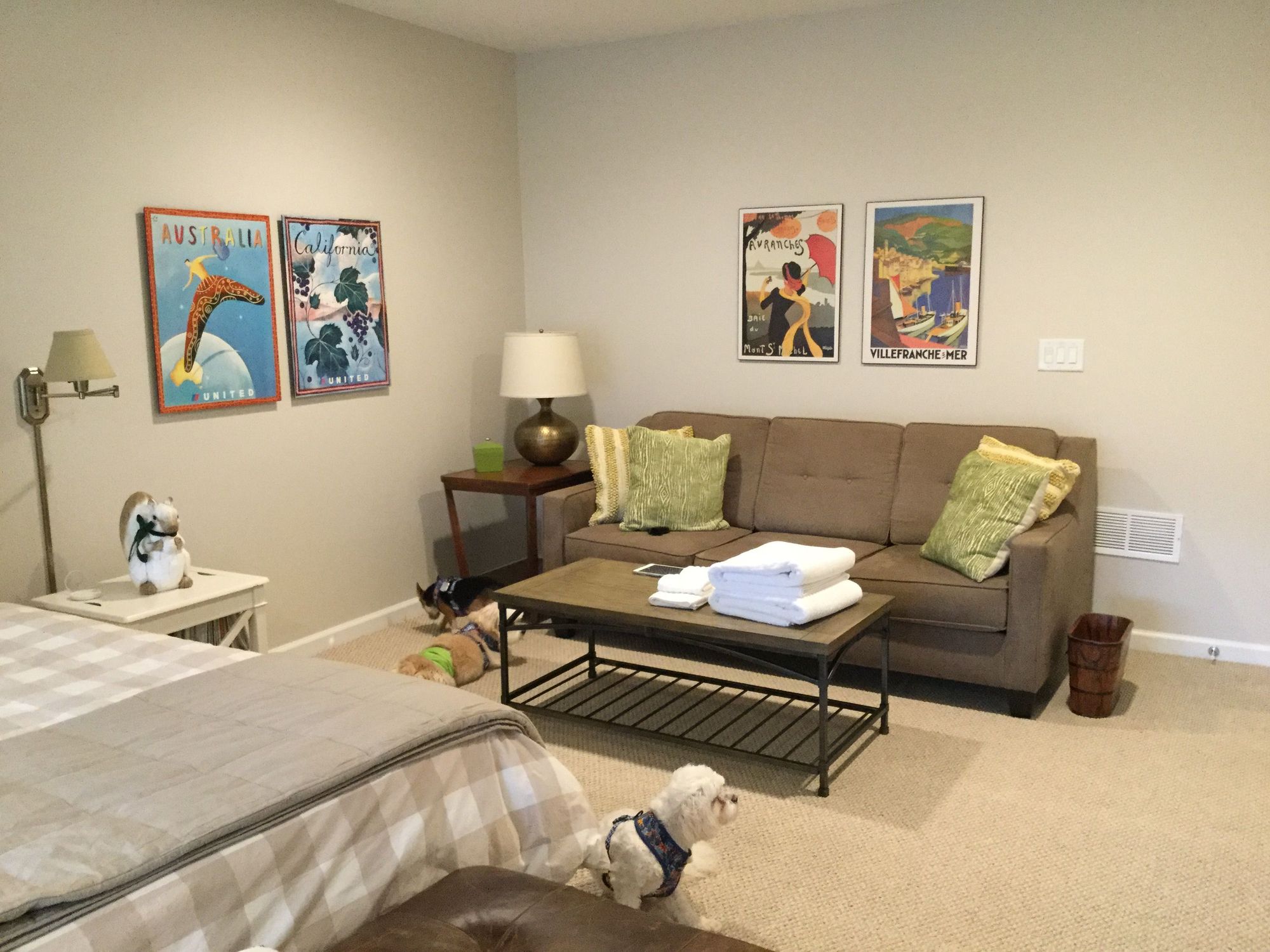 Other end of room with seating area and aforementioned squirrel in previous thoughtful placement beside their bed :). this room about 29’ long and 12’ 6” wide, largest bedroom in house (previous owners used variously as home gym and sewing / craft room).