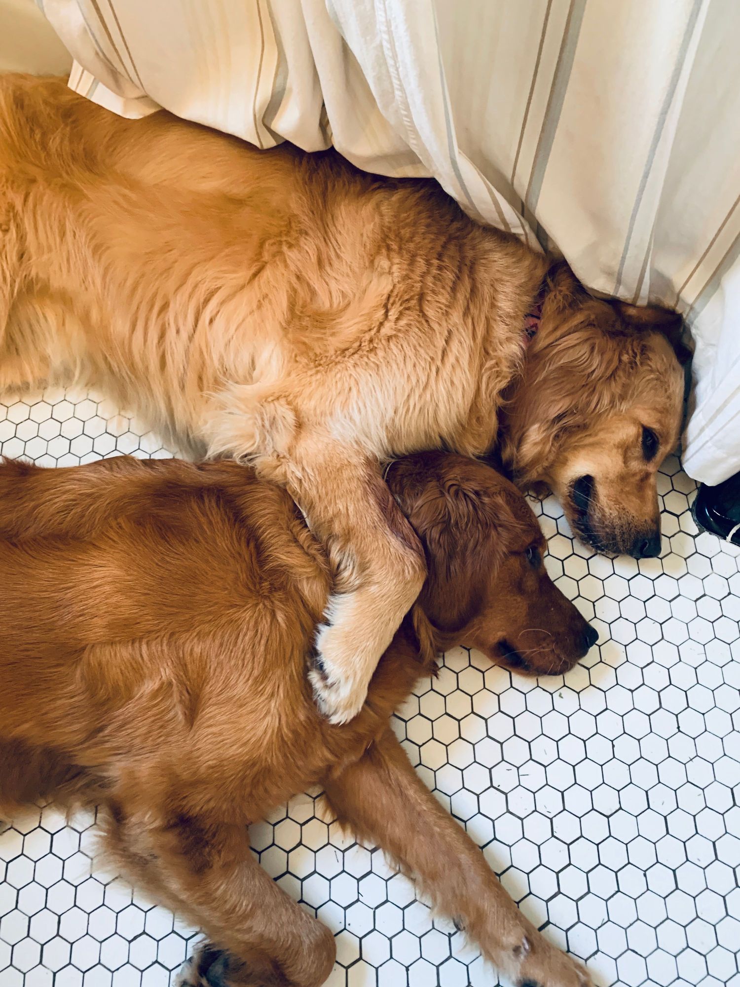 Lily and Molly sheltering in place on the bathroom floor. They hang out with me while I get ready in the mornings.