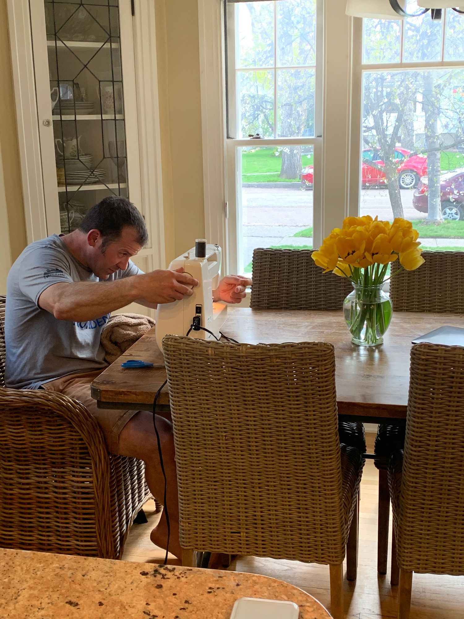A scene from this evening. He’s sewing up a tear in a bath towel. (I would have gone to Target for a new towel.)