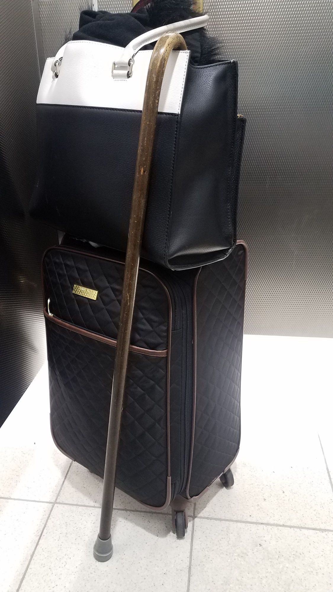 Here's a photo. I took it because I was using my Dad's old cane on a work trip after a fall. I later bought a lighter, prettier cane. On top is a Kate Spade tote holding laptop, purse, reading material, etc. The KS tote changes seasonally, but this Anne Klein suitcase has been the real workhorse for almost two years now - with constant use. Prior to C19 anyway.