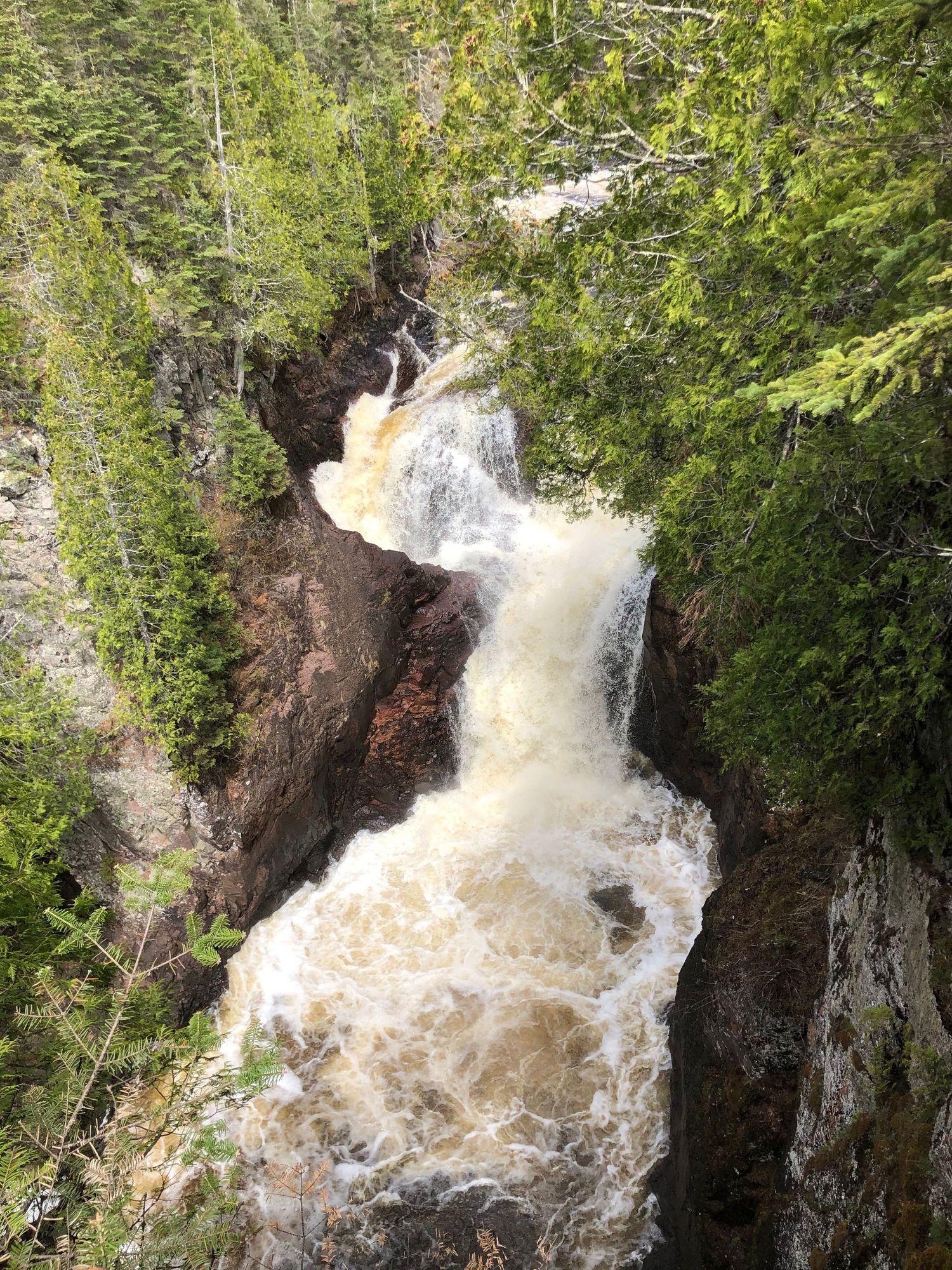 Devils Canyon Falls. Two falls drop into one spot and half of the water disappears into an underwater cavern and goes ?????? I bet the sneaky Canadians steal the water to use in their Labatts beer.