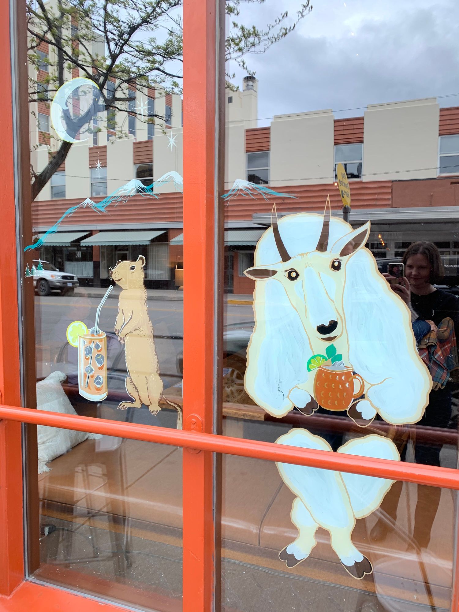 A rock chuck and mountain goat enjoying a cocktail at Montgomery Distillery.