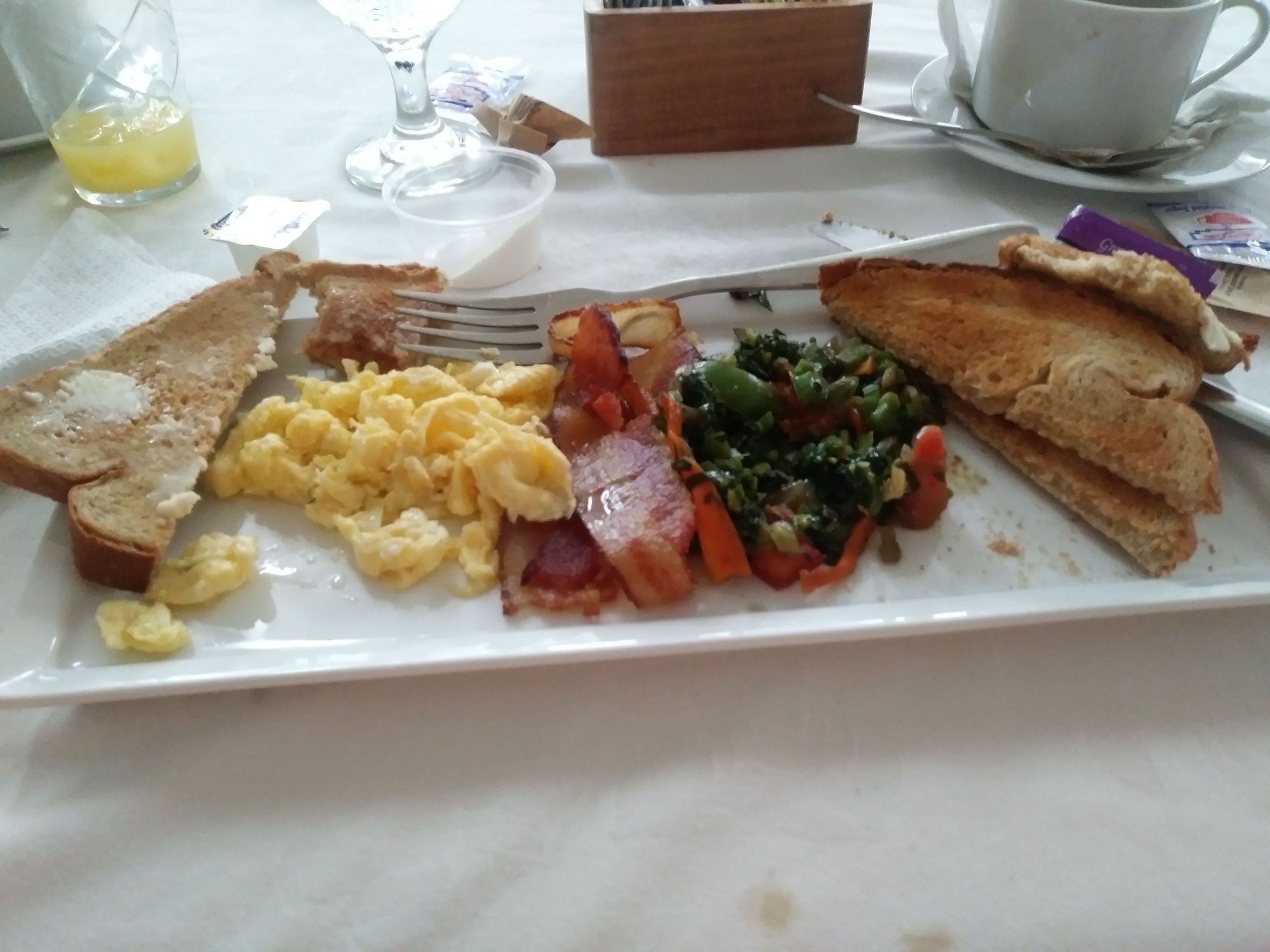 Day 2 the safe American Breakfast, bacon eggs, toast juice and coffee.