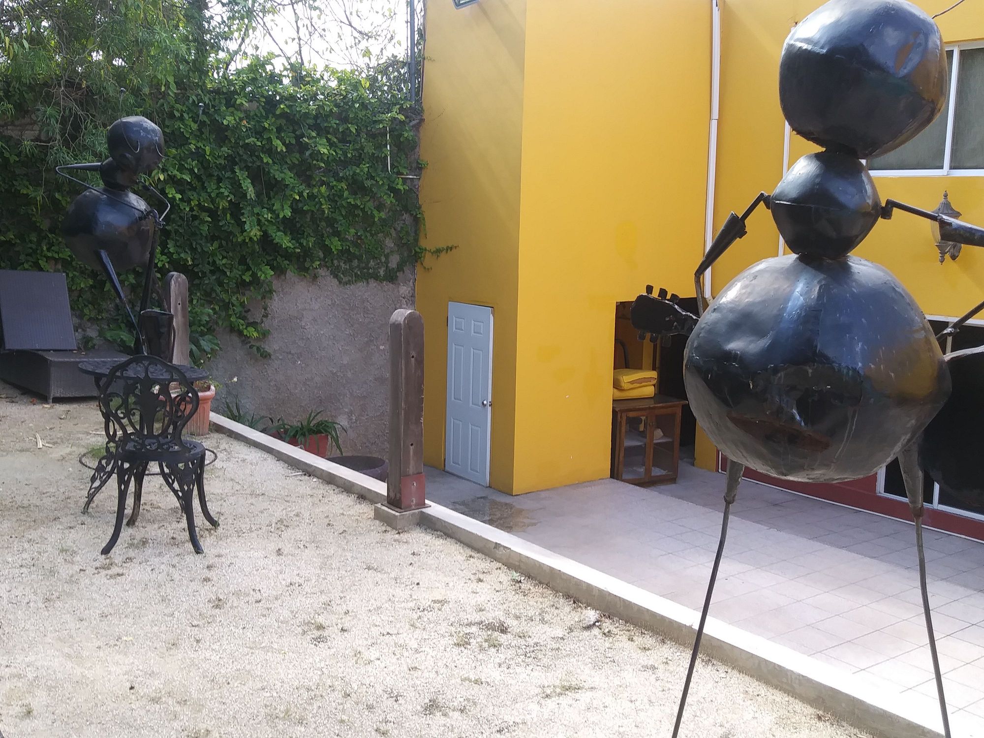 Sculpture garden next to pool and chaise lounge patio.