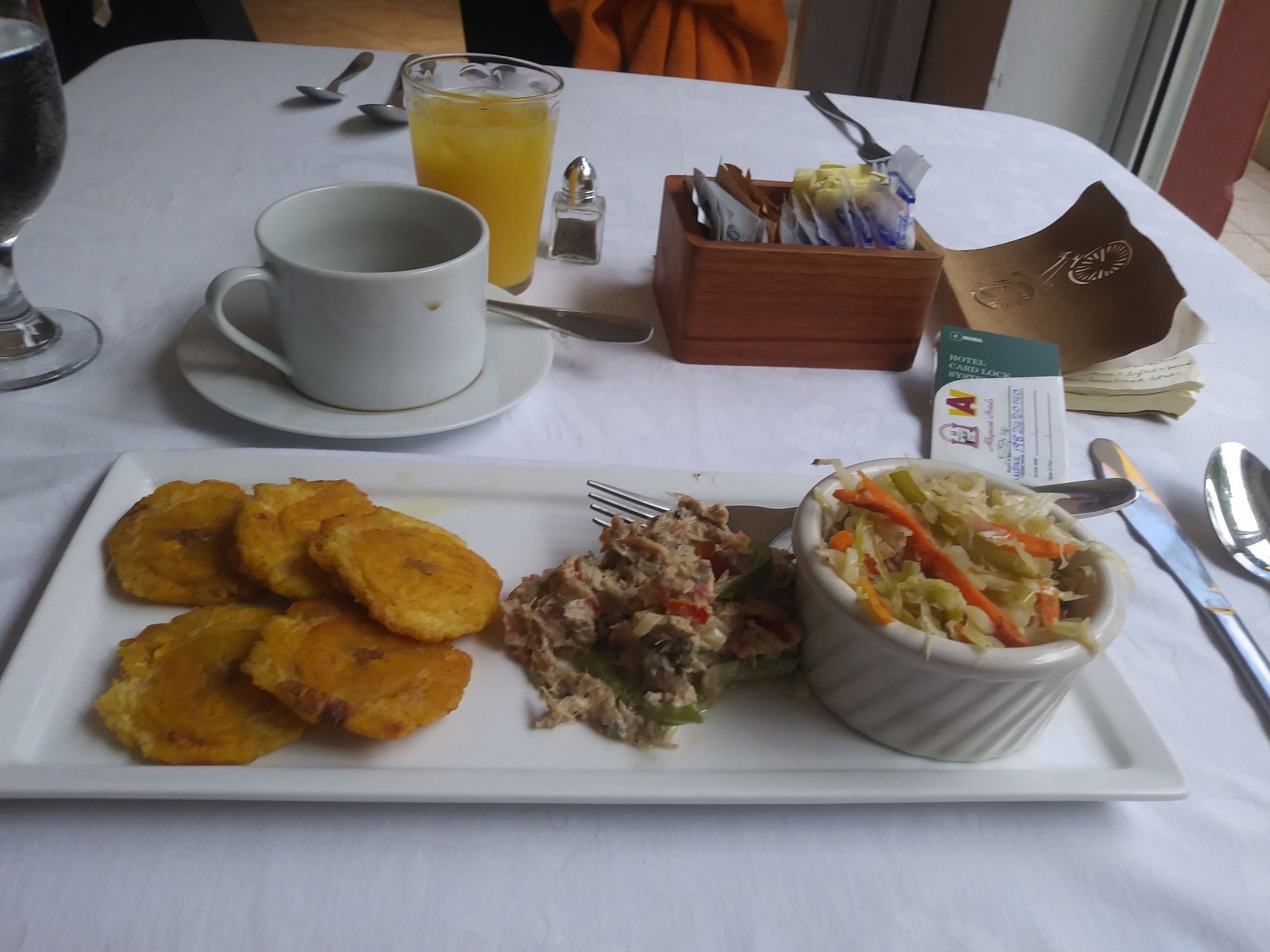 More adventurous on day 3, with a traditional Jamaican breakfast of plaintains, a bowl of the slaw that I had served to me all over the country. In center is "mackerel rundown" fish in coconut milk with red onions and peppers. "Rundown" is a sauce reduction.