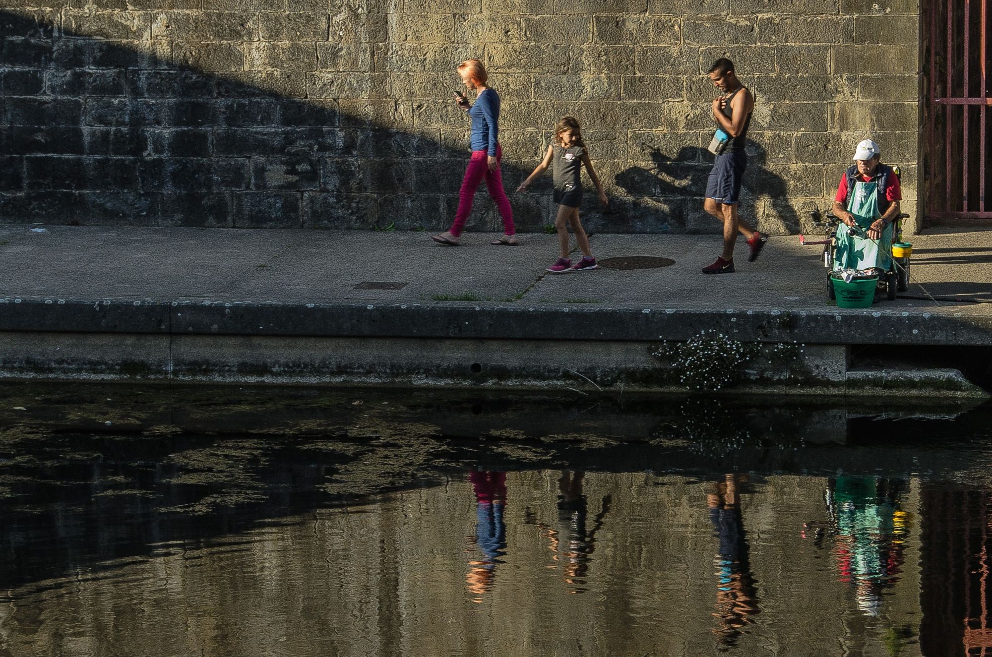 Little girl turns to watch seated fisherman.