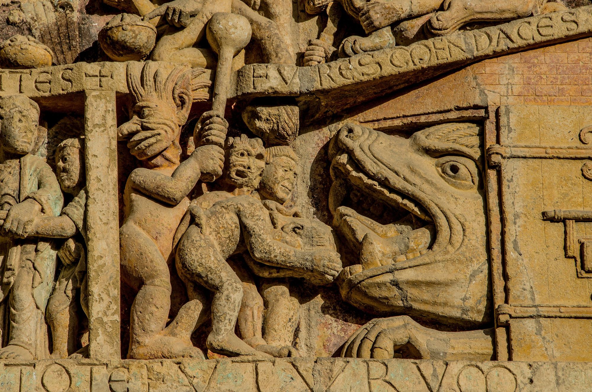 Detail from famed 12C Tympanum of the Last Judgement. This panel shows a demon forcing Trump supporters into a monster's mouth.