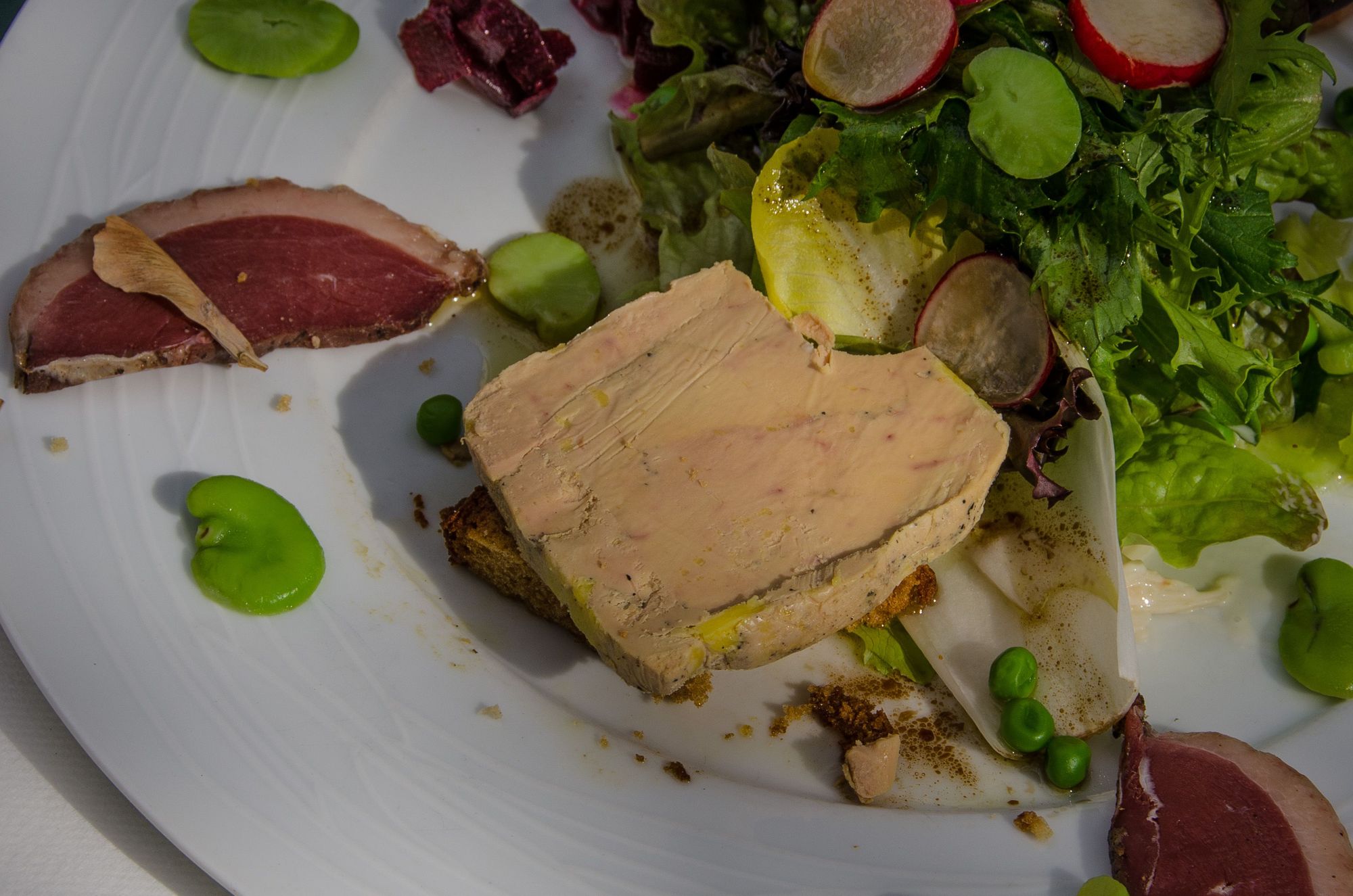 Meal @ Clos Sainte Cecile restaurant. The seed pod at top left was one of a smazzillion that kept falling from trees maple-like, at that time of year.