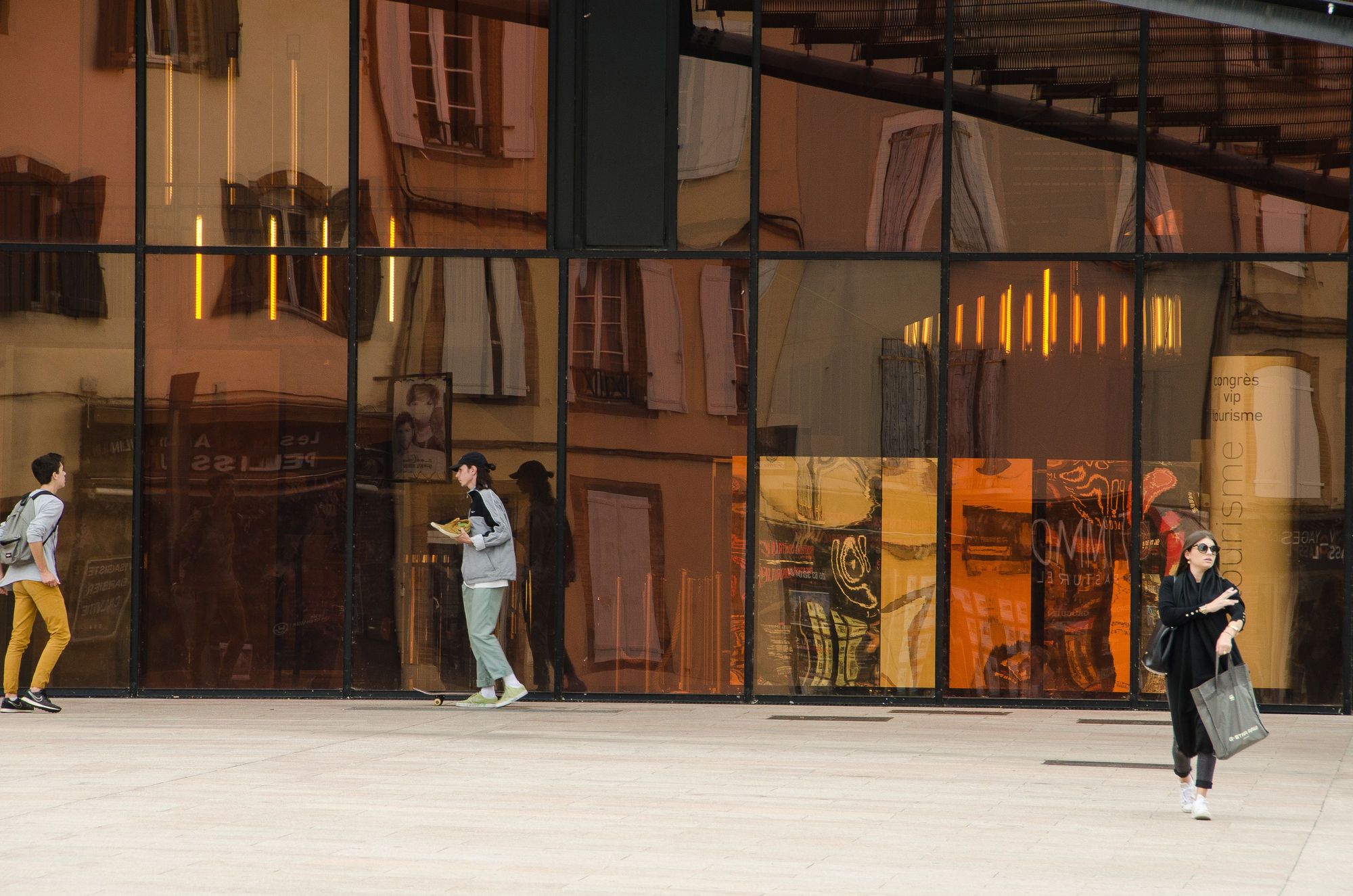 Modern multi-coloured glass facade of new Albi Theatre. Attention-seeking skater dude in center kept tossing his shoes high into the air juggler-style.