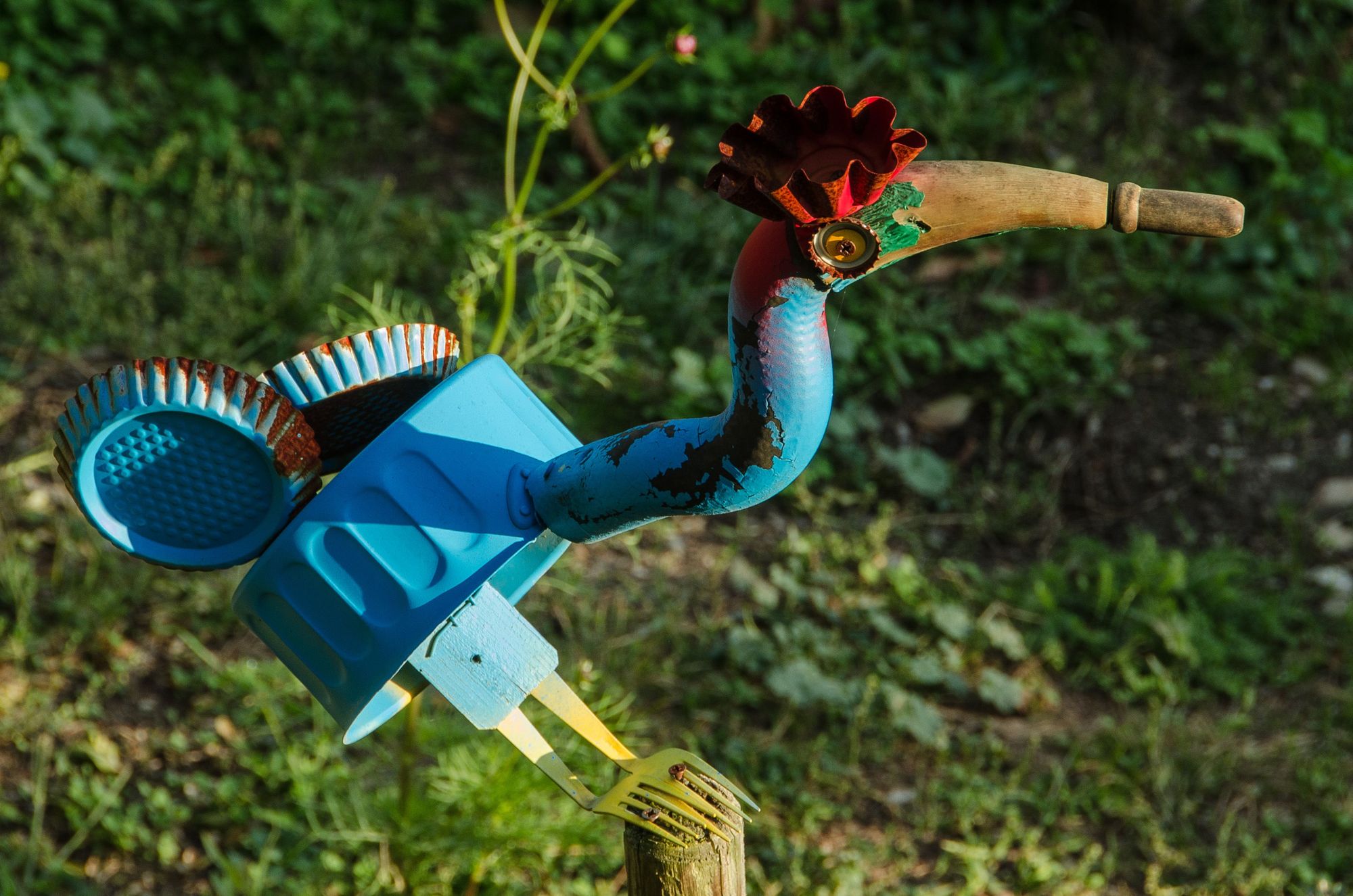 Local artiste Pierre Prevost has created a series of whimsical, painted metal bird-scarecrows that he calls 'zozlos'.