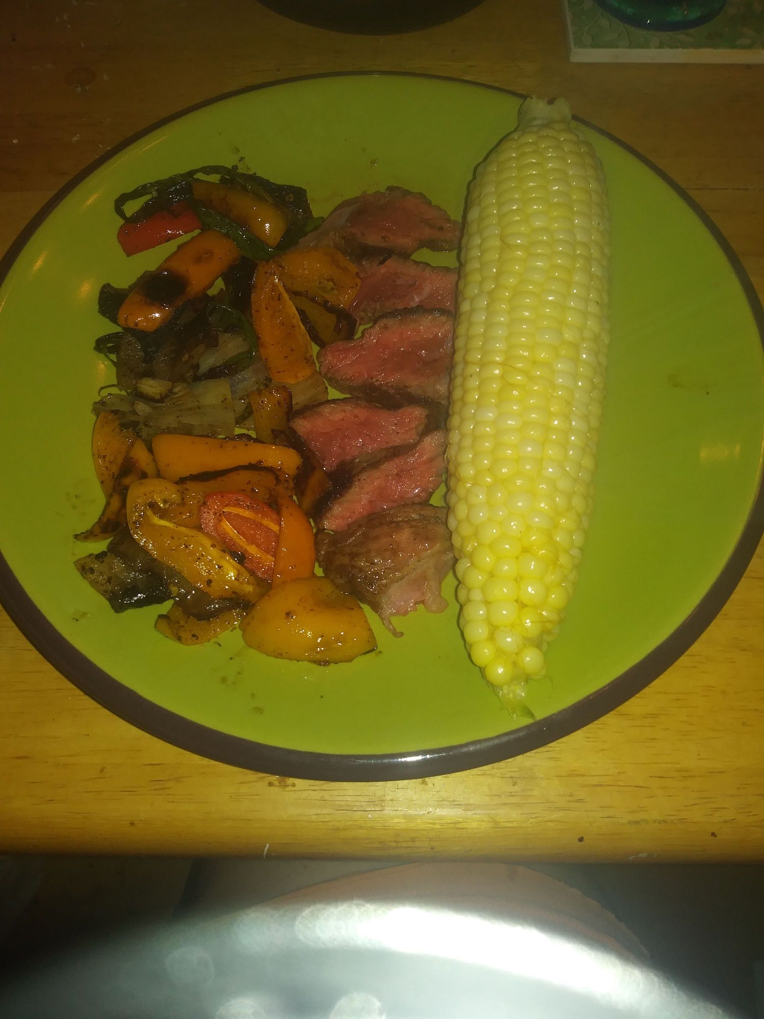 Tonight's dinner sirloin tip, mini sweet peppers and fantastic silver queen corn from farmers market.