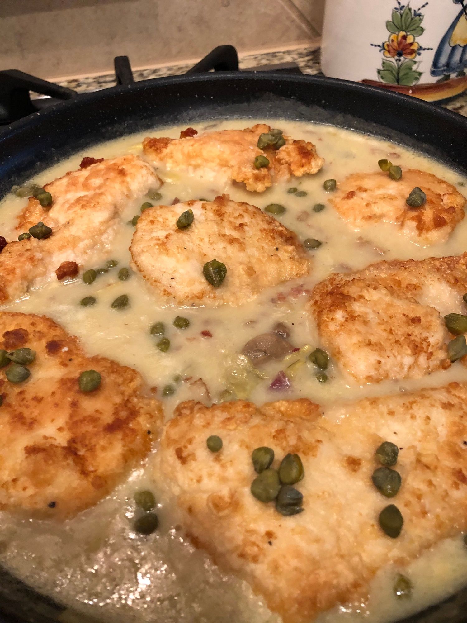 Chicken pieces added back in after sauce thickened, capers added for acidic finish. Will serve with pasta and salad. If I get my second wind I will make bruschetta to have with our 5 pm cocktail. (Mother is here, cocktail hour has been reinstated)