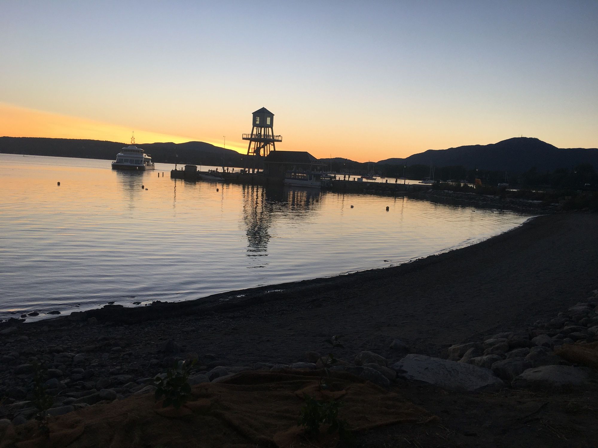 Lac Memphrémagog right by Magog town center at sunset. When I took this photo, my US friend was having supper in Newport, Vermont. Also on Lac Memphrémagog.