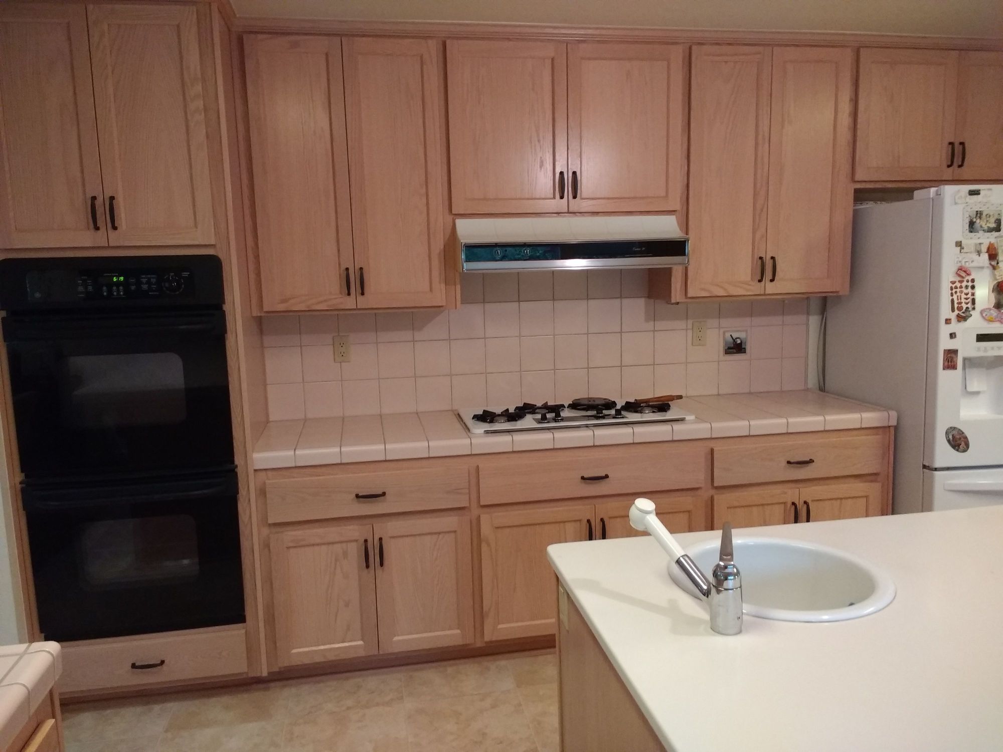 This is the kitchen wall with the double ovens, gas stove, refrigerator, and a bit of the center island.