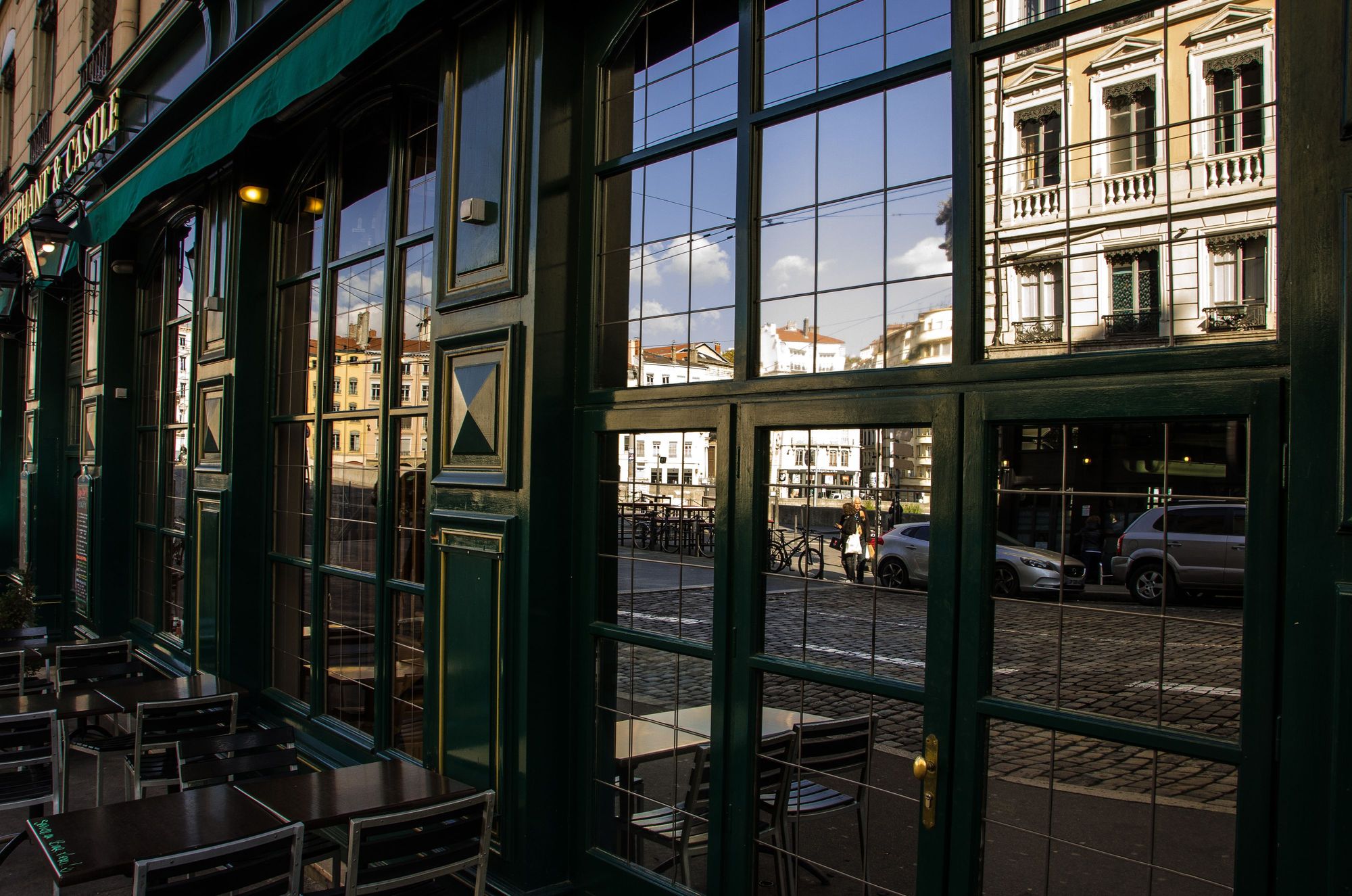 Place St. Paul Cafe window reflection.