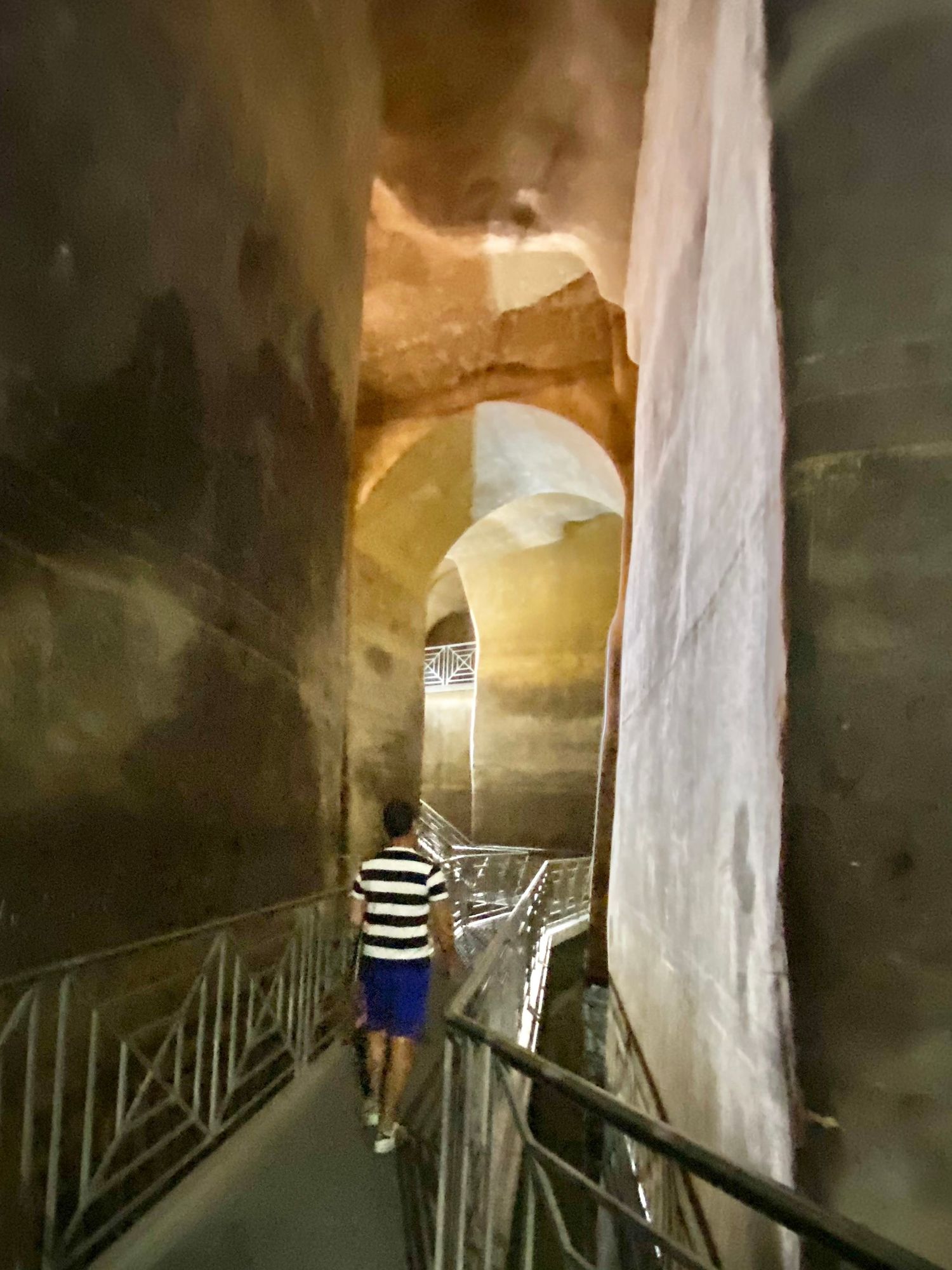 Walking through an underground cistern. You can see the high water marks on the walls. Not seen here, the holes in the ceiling where buckets were lowered to draw water.