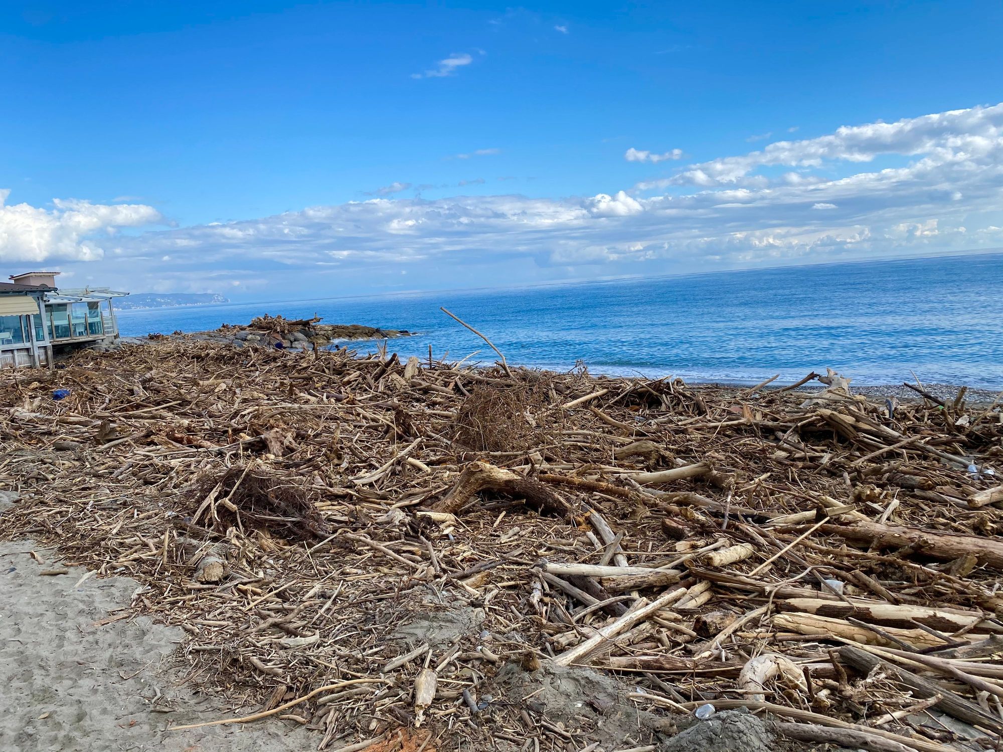 Lots of flotsam and jetsam on the beach in Albenga, with our little beach shack restaurant on the left.