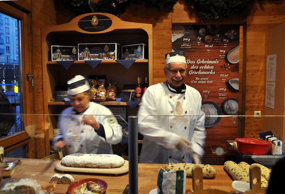 The bakers guild handing out samples for tasting Christstollen (you can buy, too.)