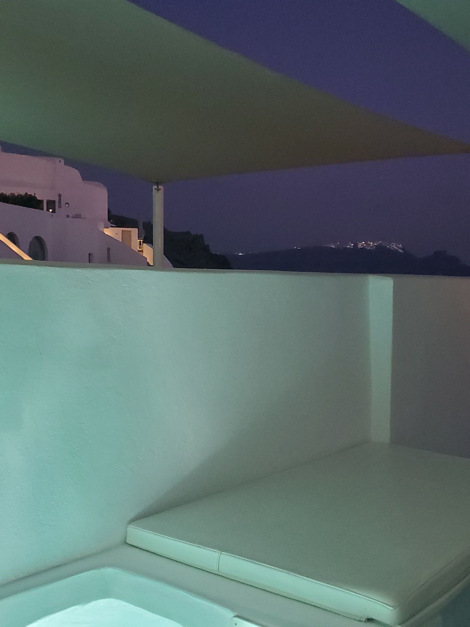 Hot tub view at night. The village mid-island is visible at the top (although not easily visible in this photo)