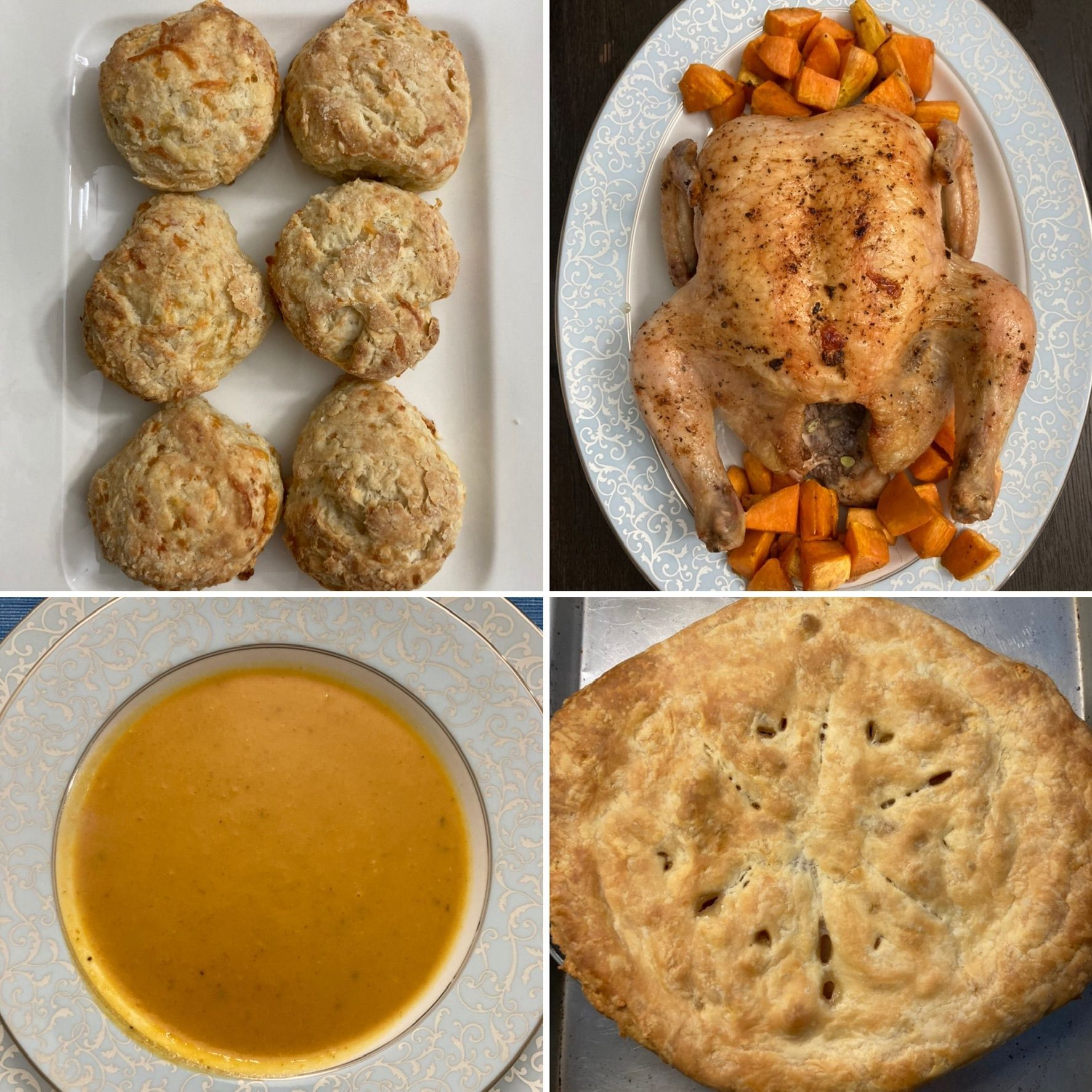 Clockwise from top left: Cheddar biscuits; roasted chicken; apple and pear pie; creamy pumpkin soup
