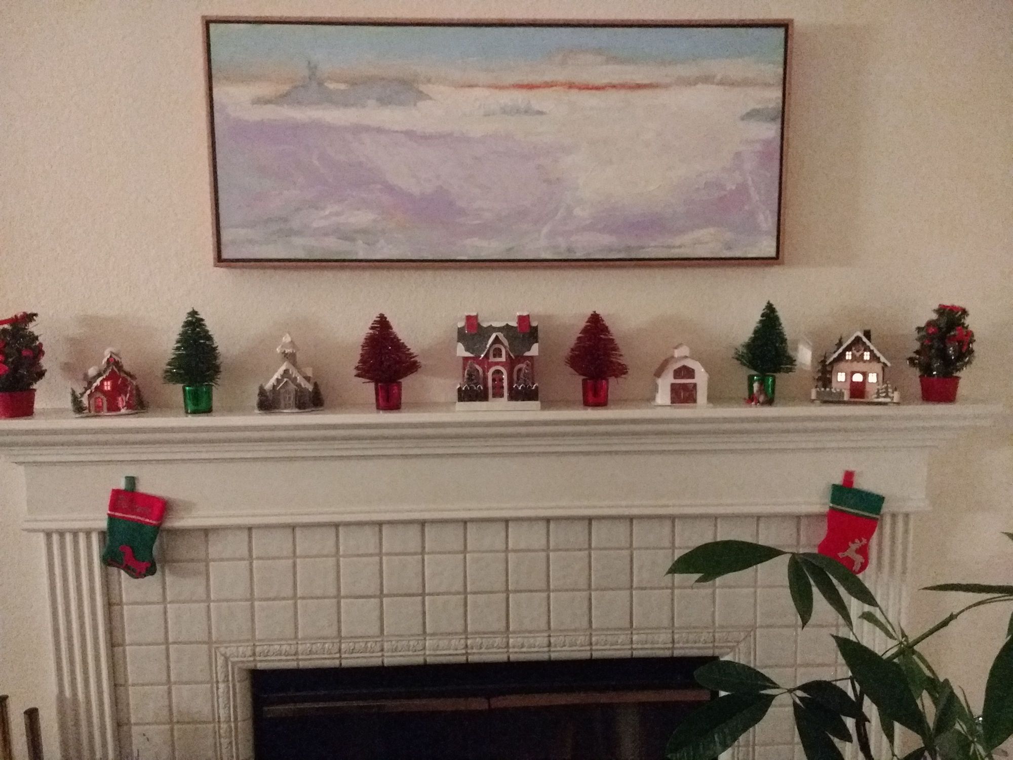 The mantelpiece. The painting above if by a local artist friend; it's of San Francisco Bay in the fog.