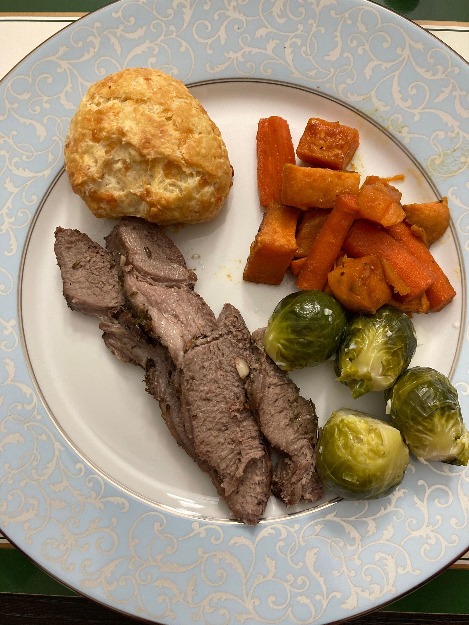 Roasted lamb, sweet potatoes and carrots, Brussels sprouts, and cheddar biscuits