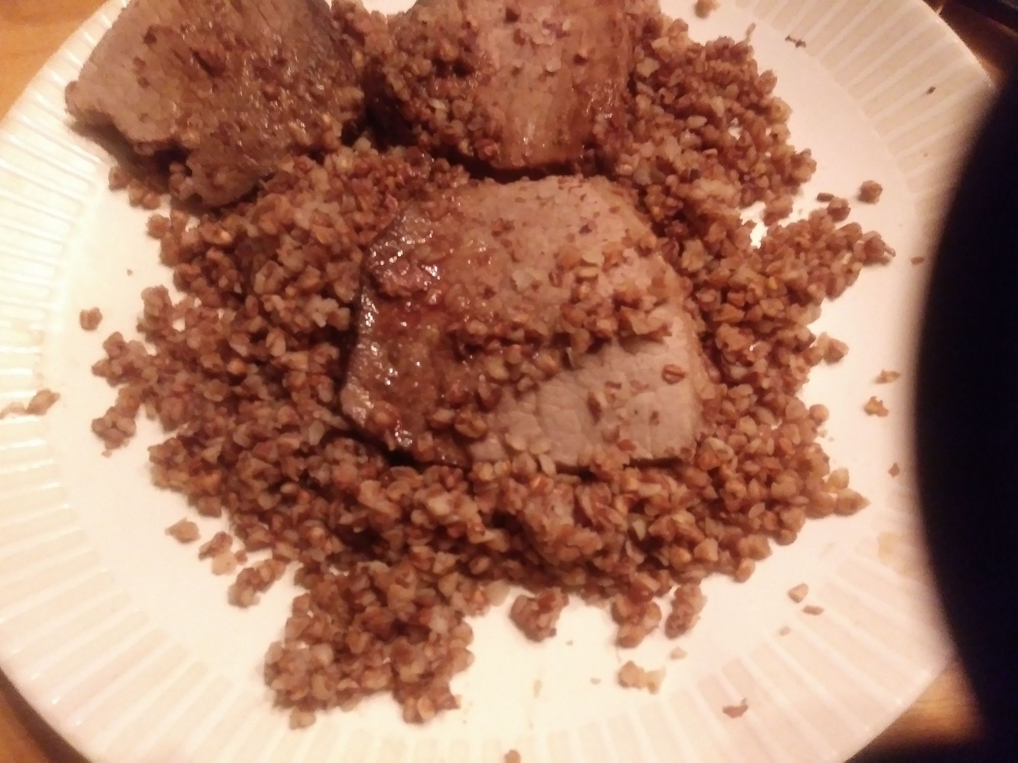 Kasha and eye round. This time I remembered to heat the beef nroth separately. The kasha stayed nice and firm.