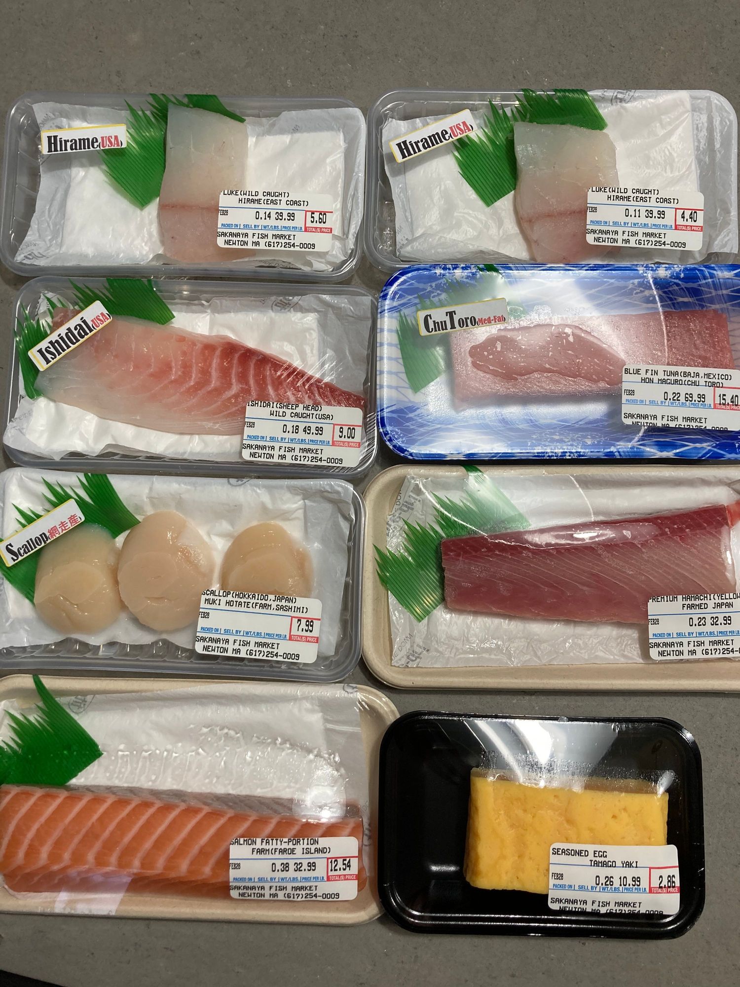 Packages of sashimi-grade dish from the Japanese fish market. I sliced them at home.