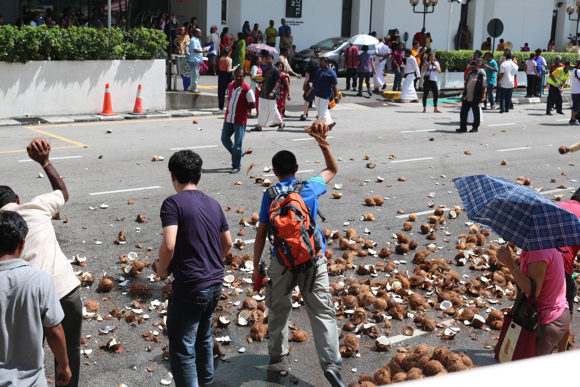 Smashing coconuts at a festival in Penang, Malaysia