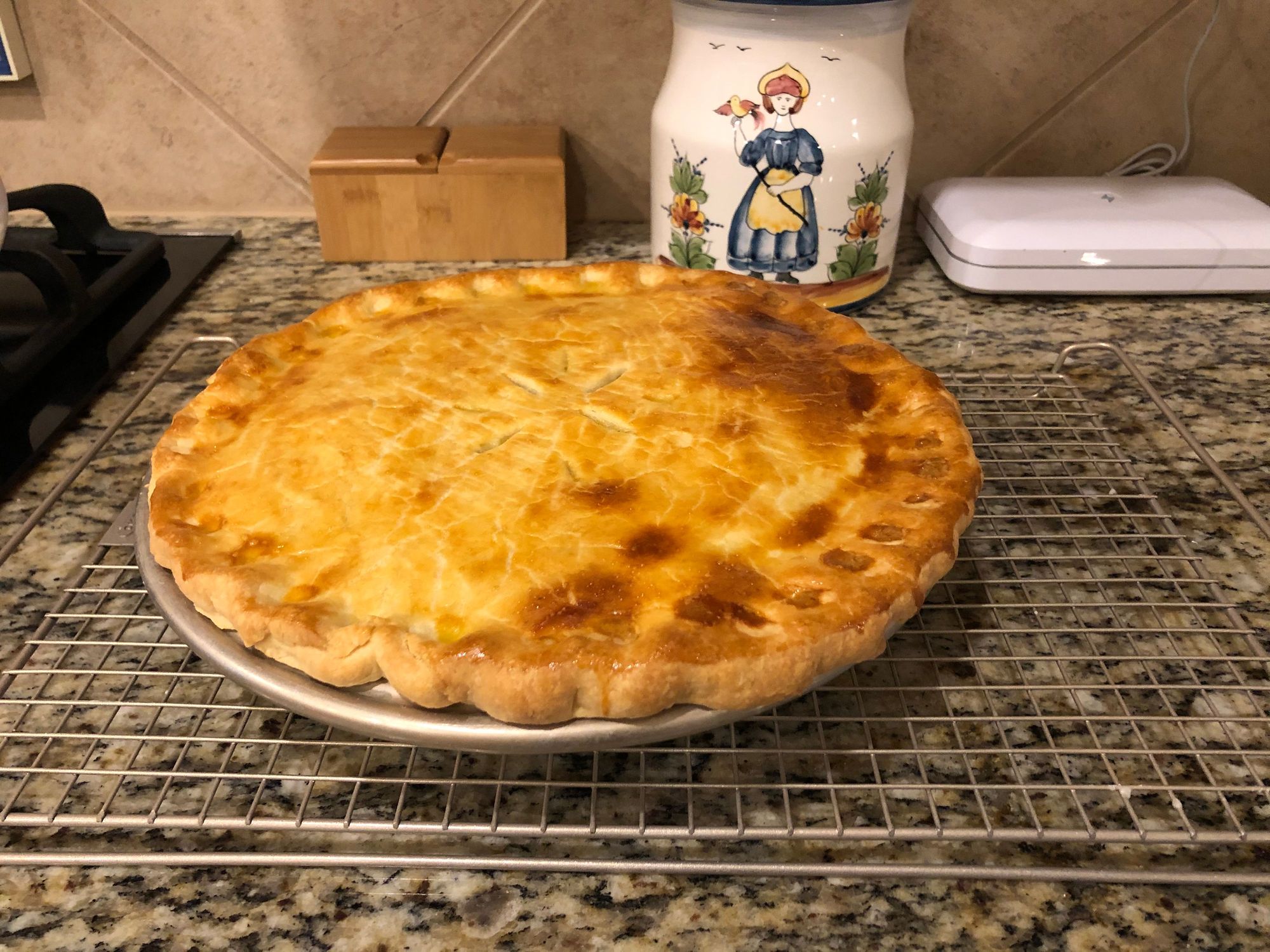 This is a large Nordic ware pie pan that is 12” instead of 9”. So this was a large pie. I made a recipe and a half for this size.