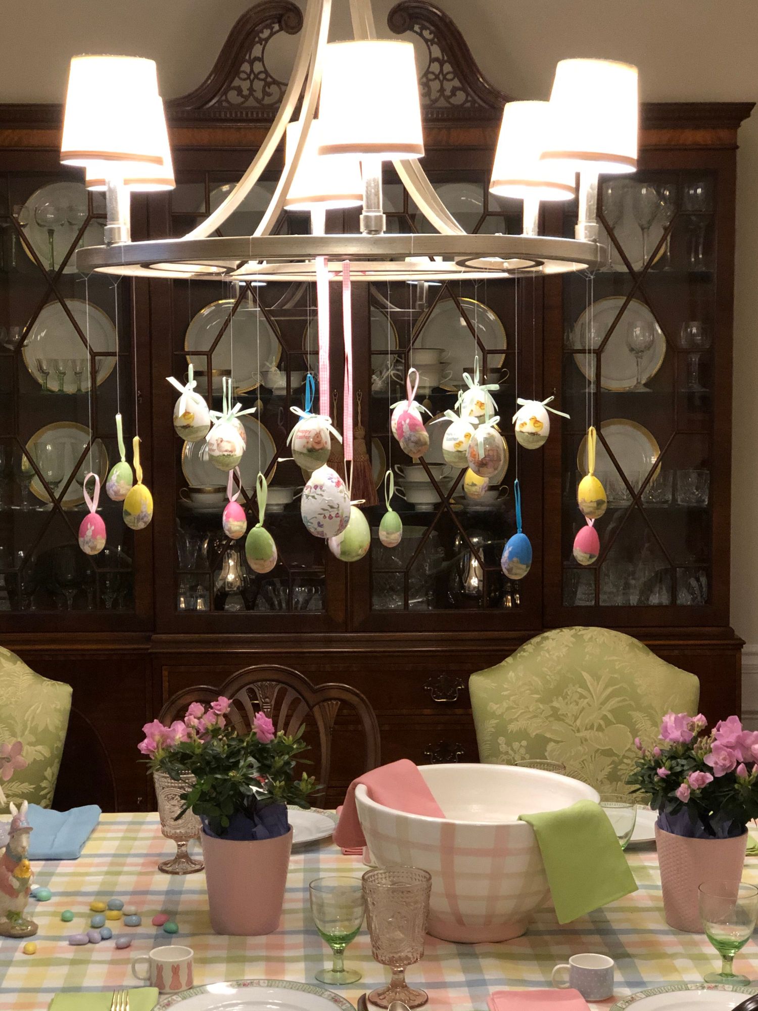 Paper mache eggs suspended from the chandelier which, because two leaves are in, is no longer centered on the table!