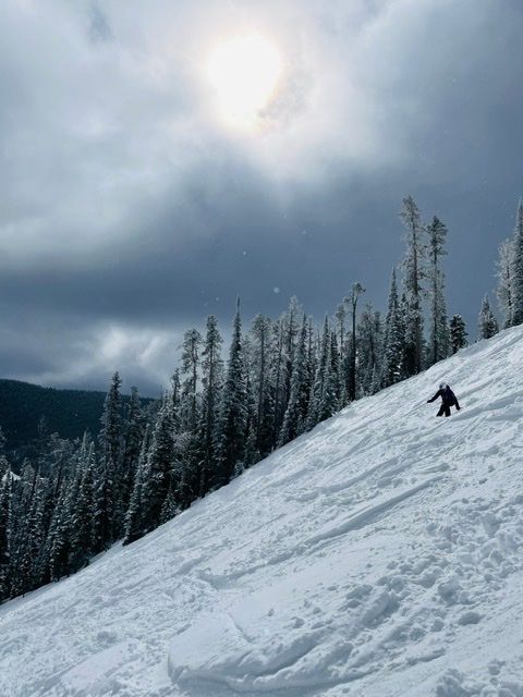 Kate finally skiing the steepest run at Showdown.