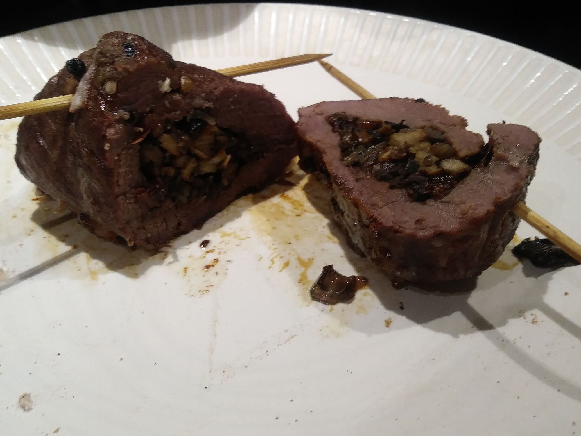 London broil marinated for 3 days and stuffed with sauteed portobello and shallots.