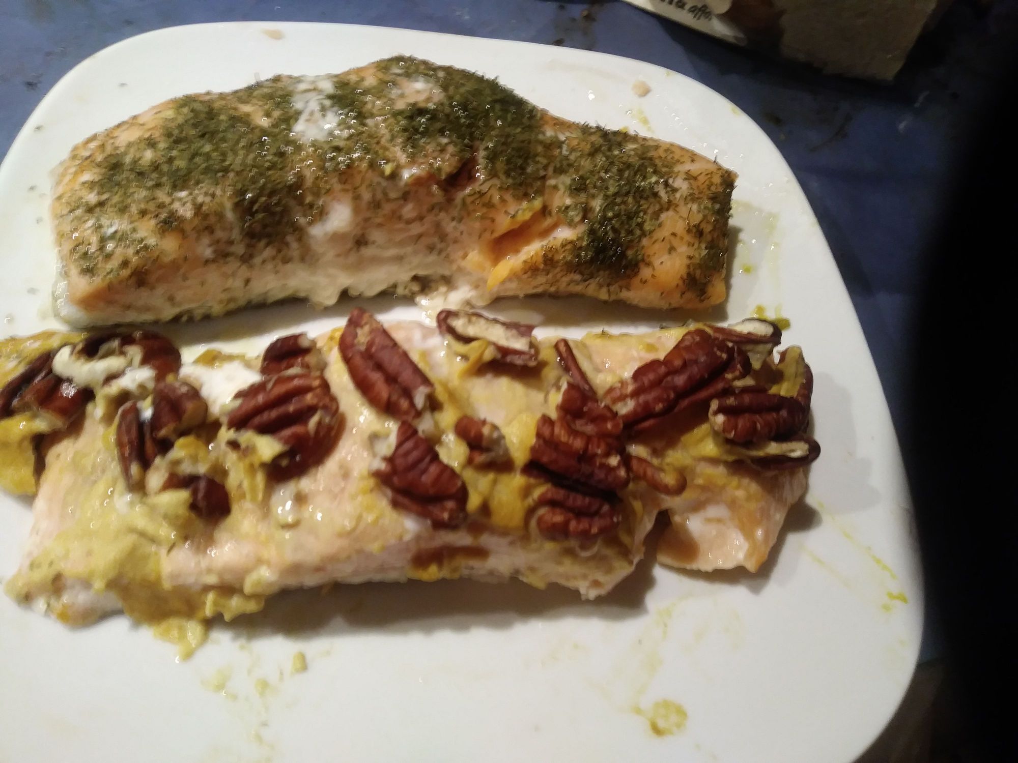 Salmon filets, one with dill, and one cooked for Sunday lunch - with dijon and pecans.