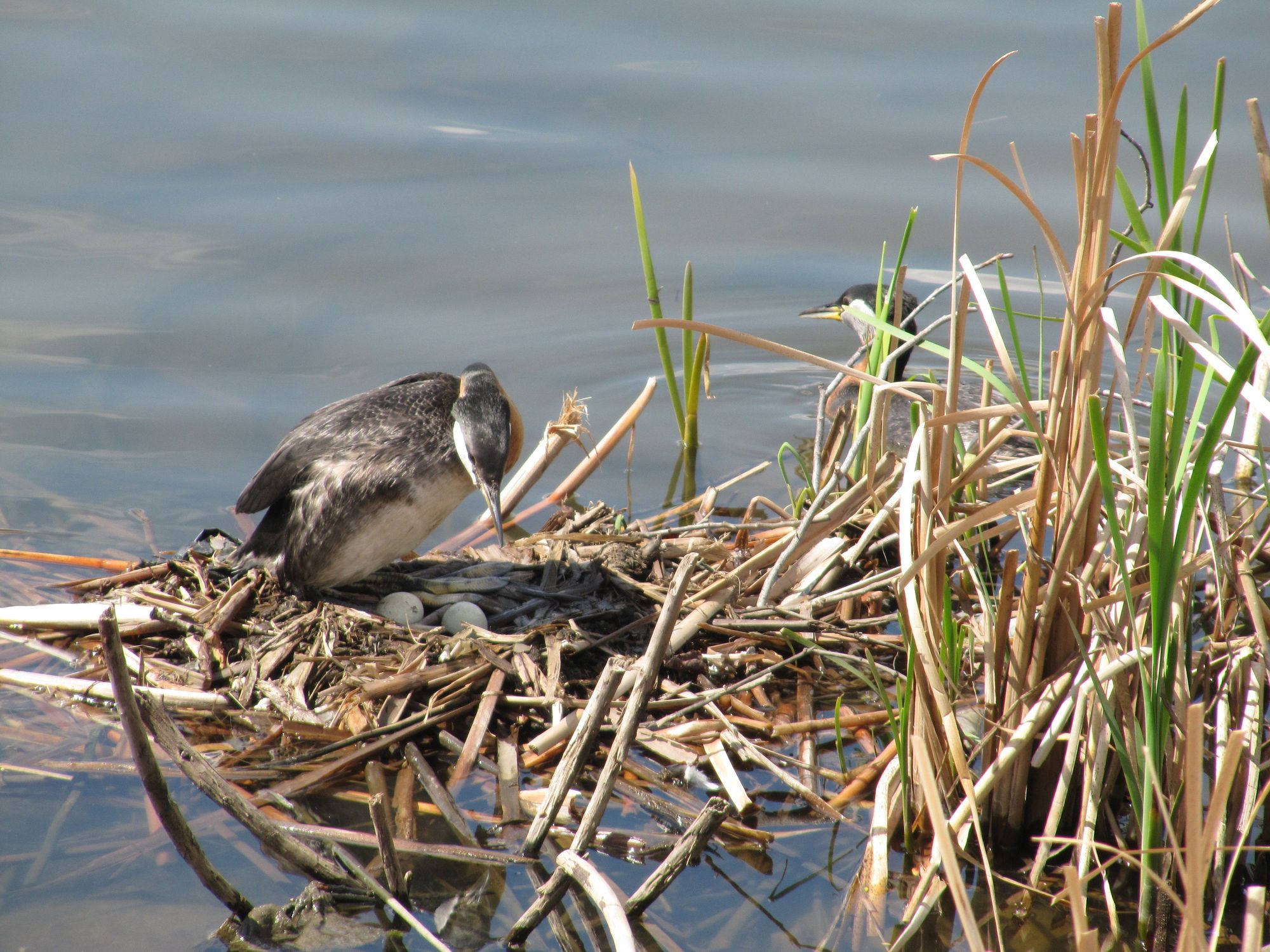 Two eggs so far, they usually lay three or four eggs. Dad is close by keeping an egg on things.