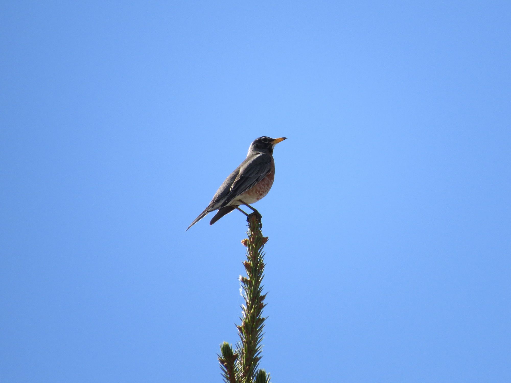 This Robin is on a very very tall Spruce Tree and he is at the very top, singing away