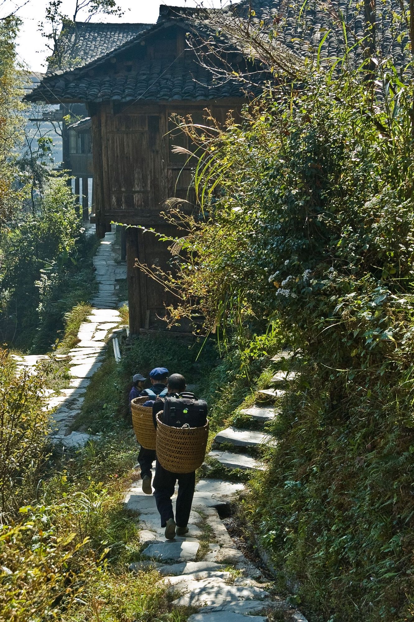 Its a 40 minute walk uphill, so locals are employed to take everyone's luggage. It was somewhat embarrassing to see seniors insisting on doing this task. Pingan was impoverished til recently and folks here are happy for the work.