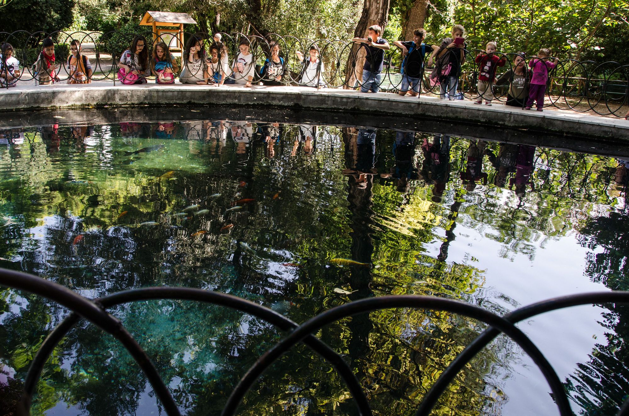 Tweeners peer into pond at National Garden in Syntagma district.