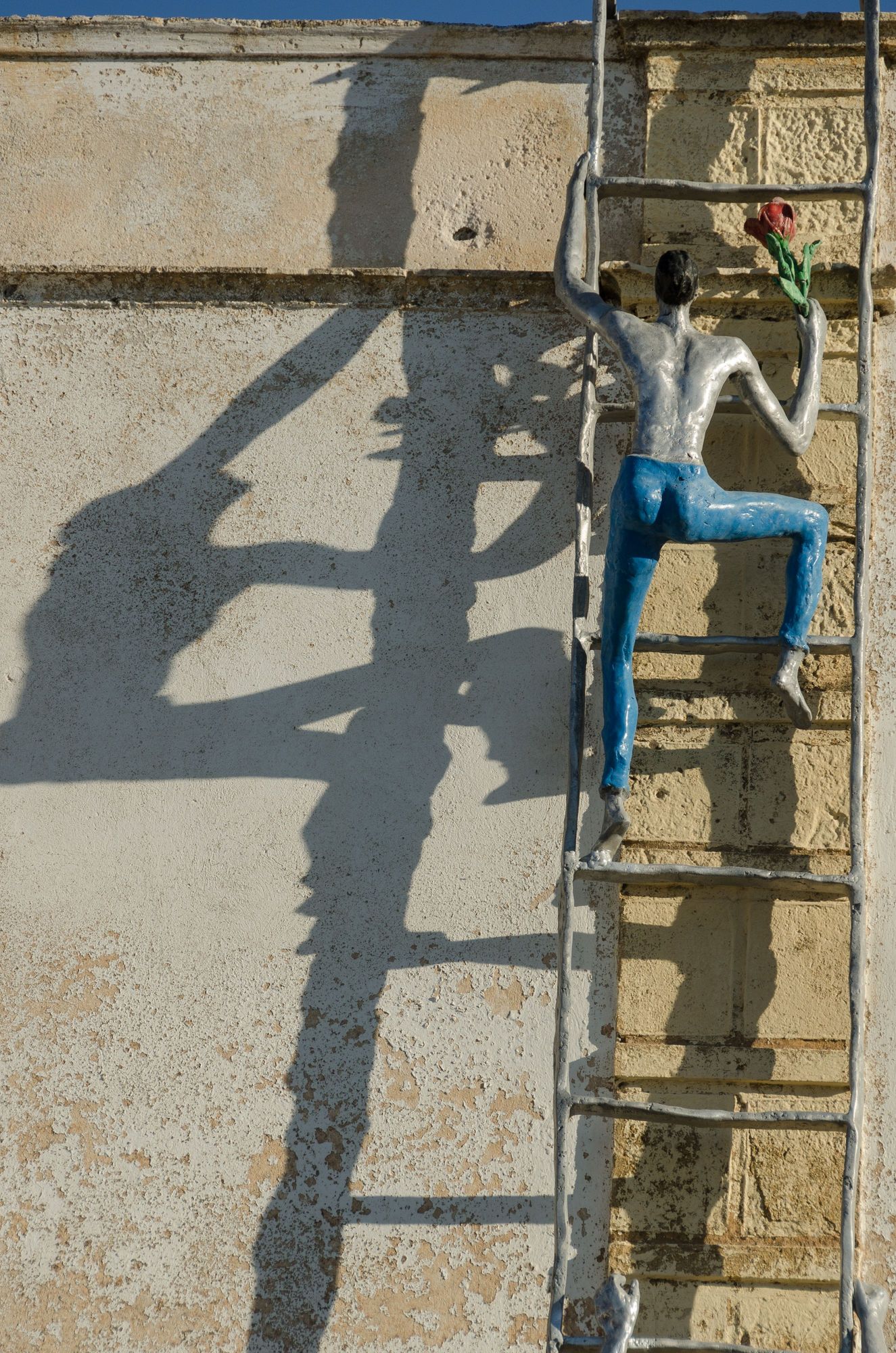 Whimsical art from the same. This life-sized depiction showed a lovestruck suitor taking a red rose up a ladder to his waiting (naked) lady at the top.
