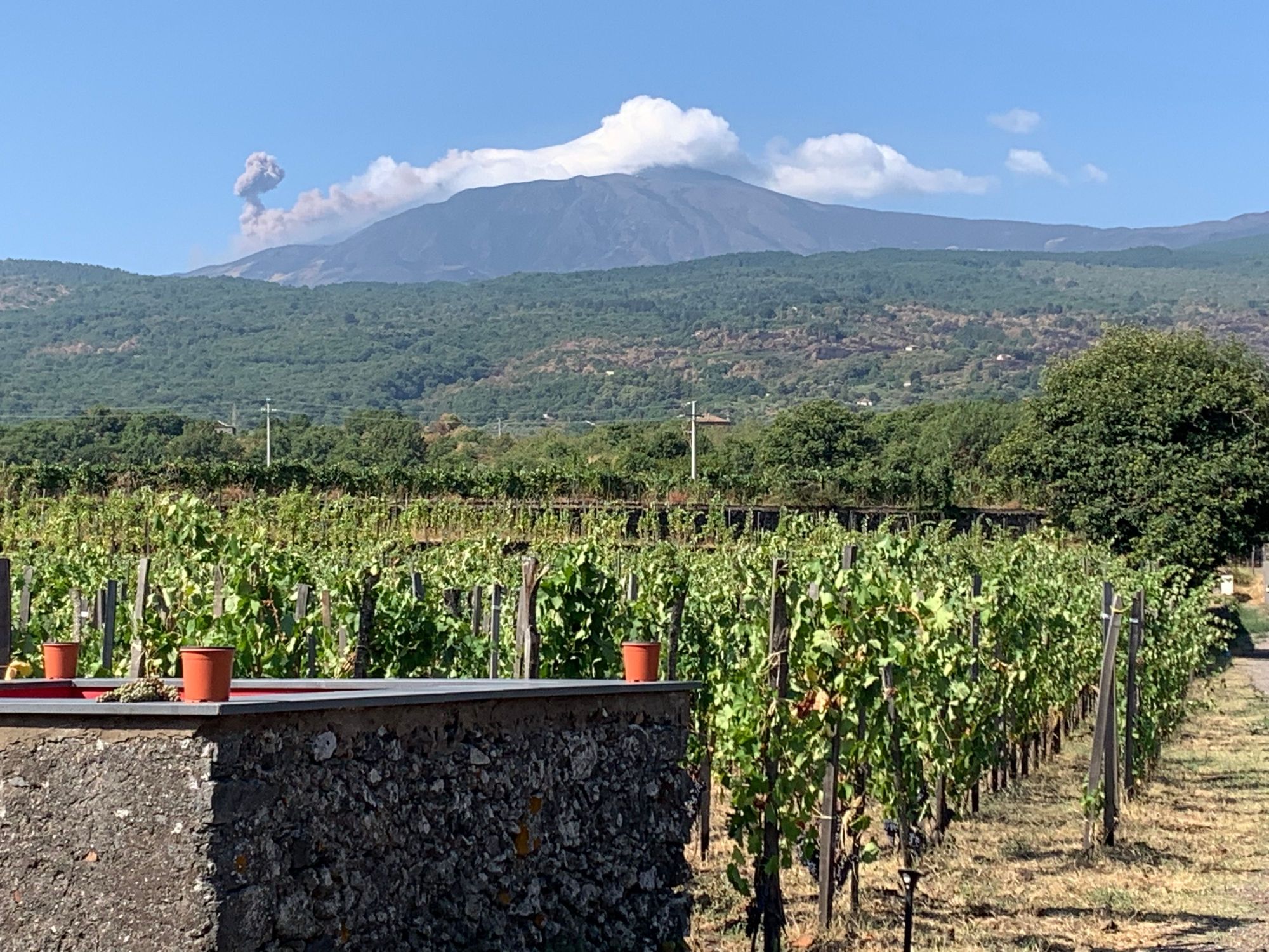 Mount Etna erupts over the vineyards right before we begin our hike.