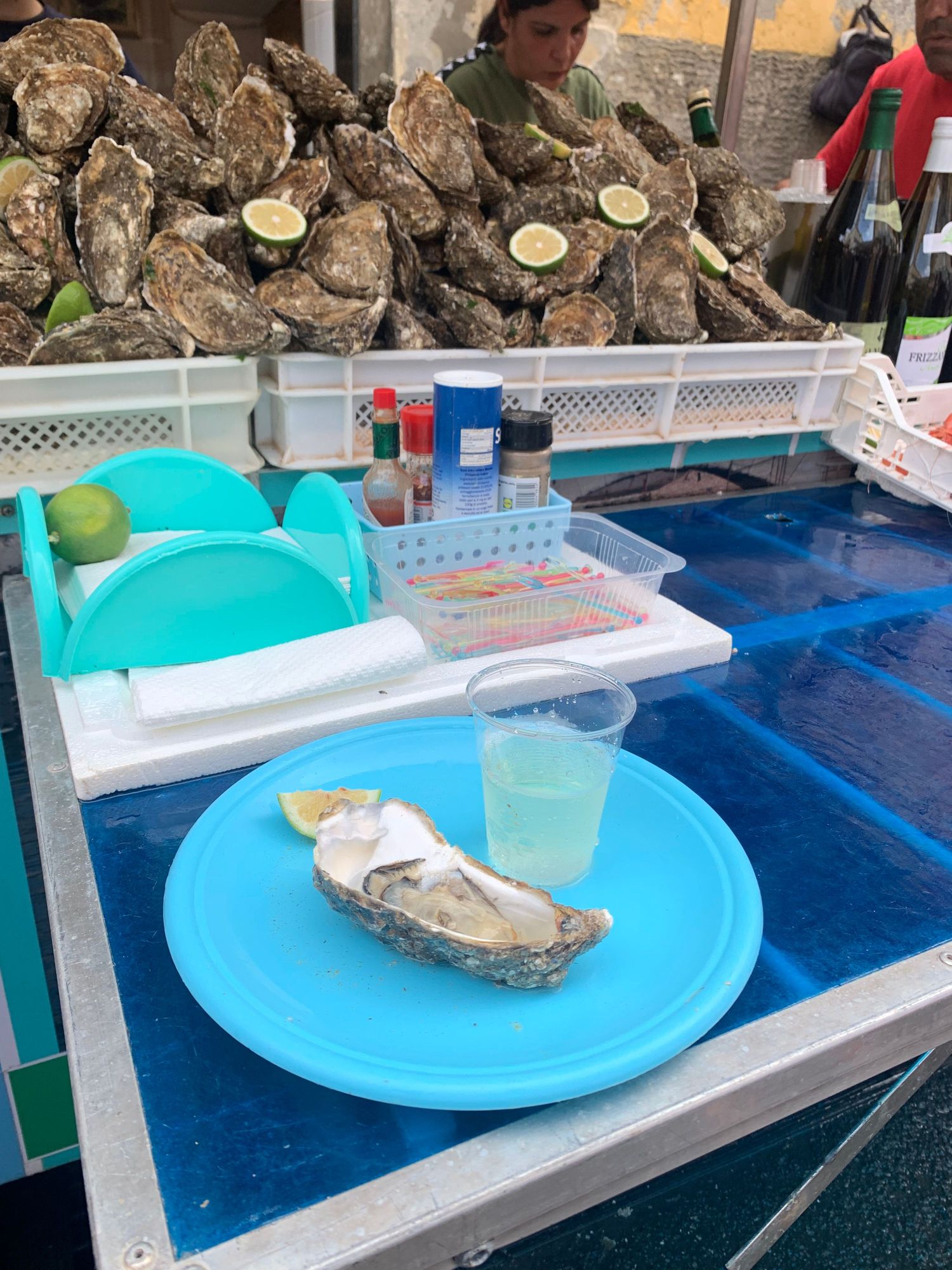 I got this fresh oyster and a glass of fizz for just 2.5 euro at the Ortigia market