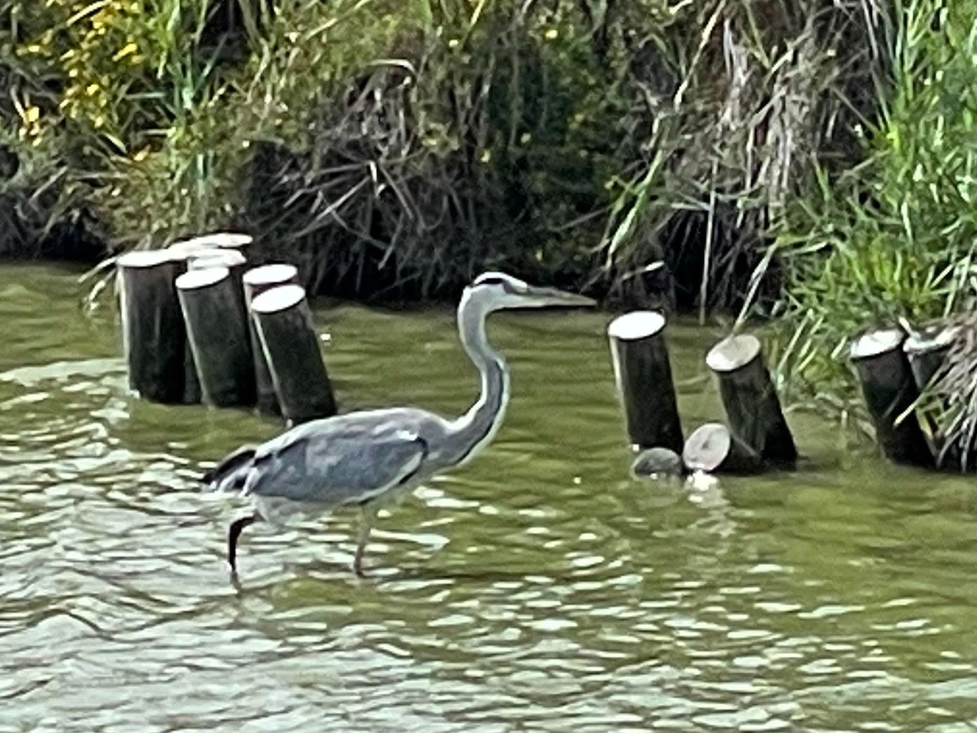 A heron trying to sneak through the flamingo herd