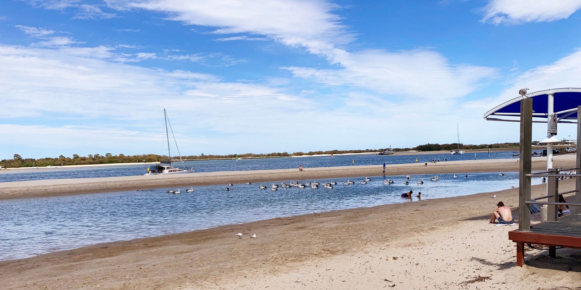 There’s a Mum & a toddler in the pond, the pelicans don’t take any notice.