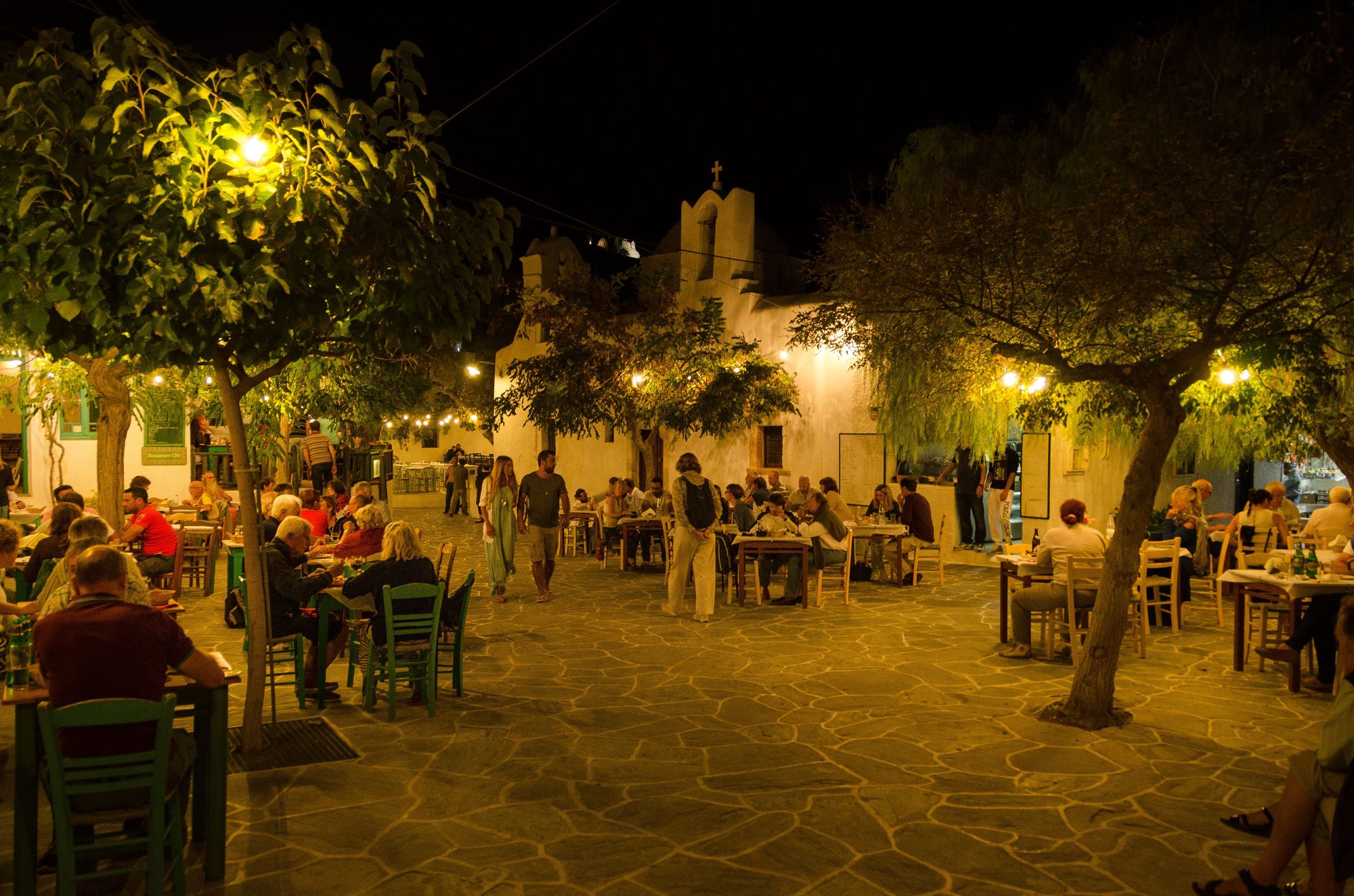 Hora by night: one of Europe's Great Travel Moments. One visiting Athenian chef likened the nightly summer atmosphere to that of an old-fashioned wedding reception: laughter, kids roaming safely and all-around good cheer, all under strings of theatrical, naked fairy lights. Throw in the intoxicating smell of 'nixta louloudi', the Greek night flower (jasmine).