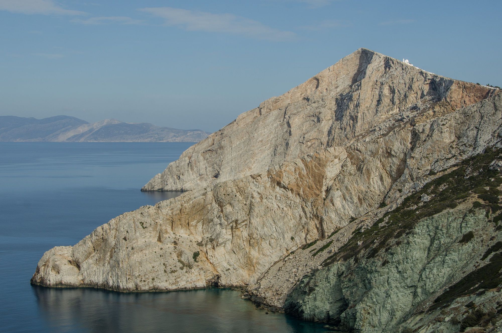 Ano Meria is the best vantage point from which shutterbugs can take shots of majestic Cape Panagia, with Cape Mistrouli and its green schistose in the foreground. We'll devote a section entirely to that multi-useful slate (such as the building block slabs featured in the below shot) later on in this foto essay.